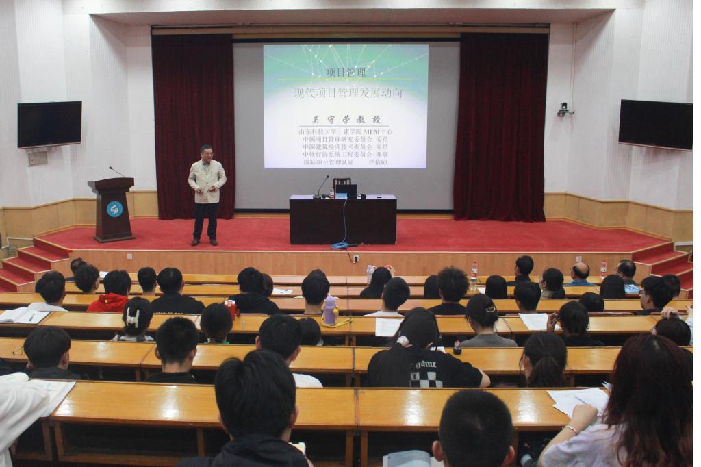 吴守荣强调,现代项目管理是全面的项目管理,所追求的不仅仅是项目的进度、费用及质量目标的完成,更需要创造一种环境,以满足不同利益相关者的需求。他对参会师生提出三点希望:一是要增强环境适应能力,通过对环境的适应与分析,正确处理项目与环境的关系,变不利因素为有利因素,不断培养适应环境的能力;二是要具备行为能力,在日常学习和工作中,面对错综复杂的环境,要养成正确处理各种信息的能力,迅速作出有效决策,把握事情的发展方向和发展路径;三是要提高技术能力,认真学习专业知识,努力拓展宽口径知识储备,积极参与学科竞赛、课外竞赛,增强自身“硬实力”,助力职业发展规划。