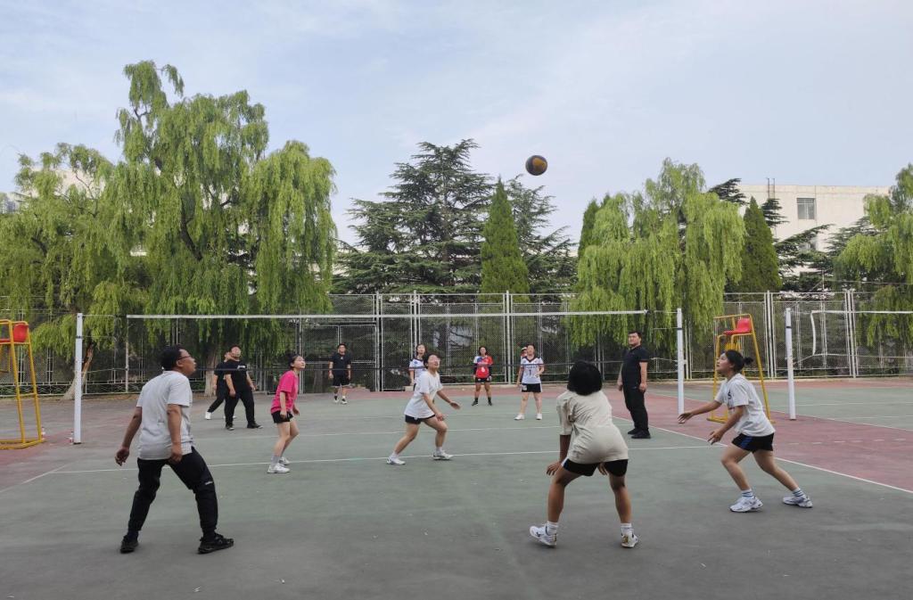 随着热身结束比赛正式开始,双方队员迅速进入比赛状态。学生队员组织队内配合,积极展开进攻,教职工队在做好防守的同时,组织反攻。大家发球精准,接球稳重,扣球有力,每一次完美的传球与得分都引来阵阵欢呼。赛场上,师生们全力以赴,每一个垫球都凝集着团结,每一次扣球都尽显他们青春的活力;老师们也洋溢着自信的笑容,饱含激情与同学们配合默契,尽显飒爽风姿。