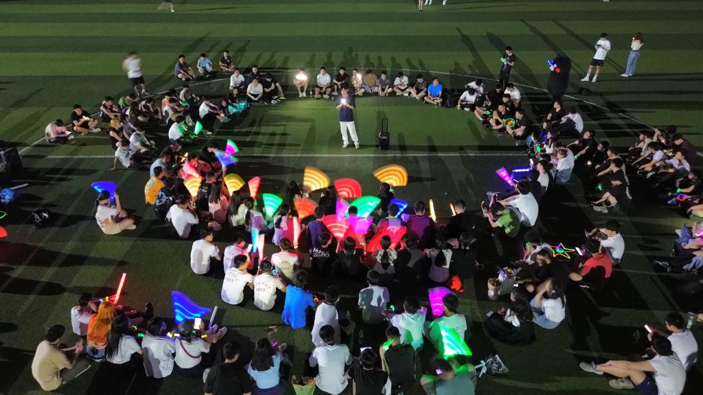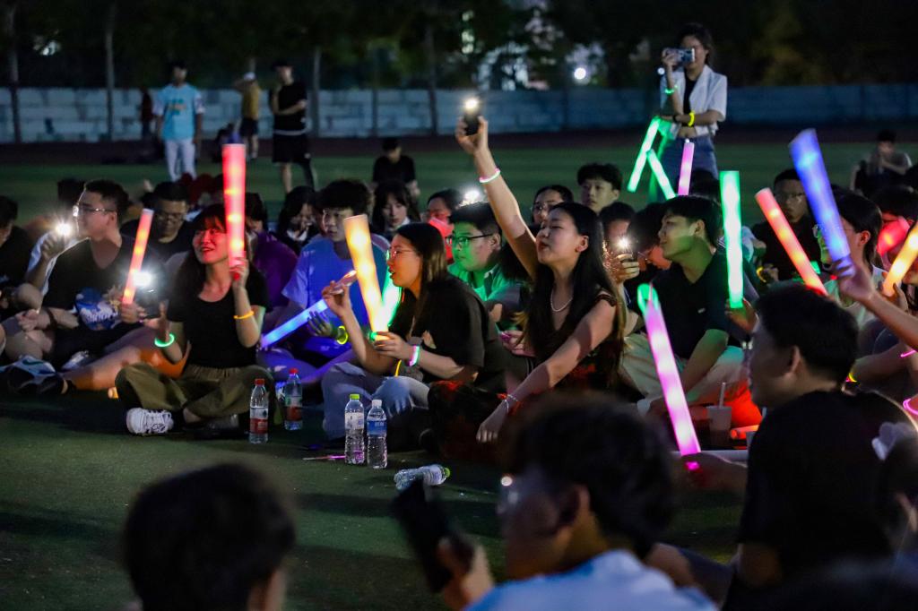 凤凰花开,骊歌奏响,灯光摇曳,音符跃动。操场上,毕业生辅导员们与同学们开展一场属于2023年夏天的荧光晚会,用歌声互诉衷肠。一根根荧光棒跟随着现场的节奏一起挥动,在空中汇成了一片片五彩斑斓的颜色。舒缓悠扬的歌声带领同学们回到了那个初遇的秋天,老师们深情地诉说对同学们的寄托,“还记得你们刚开学去迎接你们的样子,没想到转眼就要毕业了,即使你们即将离开我的絮絮叨叨,但我盼望着未来的你们能够发光发亮,成为栋梁!”近在耳畔的旋律,情深意切的演唱,这一幕,定将成为同学们最难忘的青春回忆。荧光晚会落下帷幕,但属于毕业生们的青春永不散场。
