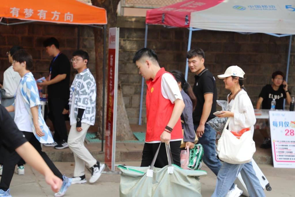 学长学姐为新生搬运行李,热情帮助新生解决问题。