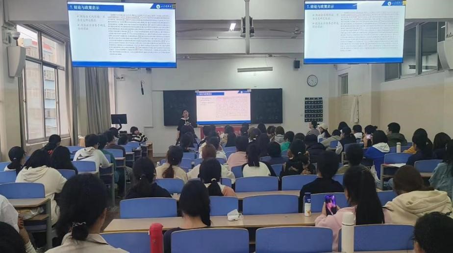 随后,王雪莹围绕学术论文组成的前置部分、主体部分、附录三大部分,从标题、作者姓名和单位、摘要与关键词、中图分类号与文献标识码、引言、文献综述与理论分析、研究设计、实证结果与分析、结论与政策启示、创新点、参考文献、附录等论文构成要素,逐一详细直观地进行写作规范讲解,强调学术论文写作的科学性、创造性、理论性、平易性,给同学们提供了丰富实用的方式方法,教育引导同学们树立正确的科研观,积极主动进行学术探索,促进学院优良学风的创建。(文:陈书彤 图:石健行 陈潇)