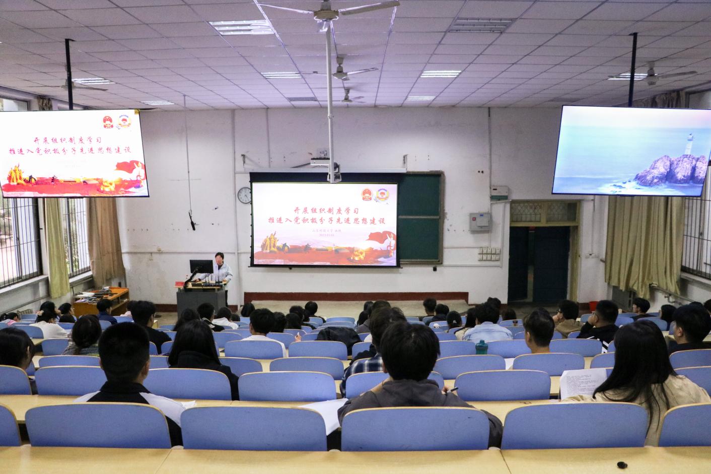 11月3日,资源学院学工办主任、团委书记、第四党支部书记洒艳在1A107为入党积极分子讲授“中国共产党党徽党旗条例”与“开展组织制度学习推进入党积极分子先进思想建设”专题党课。