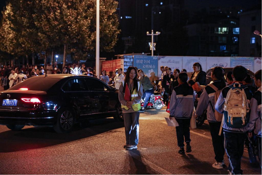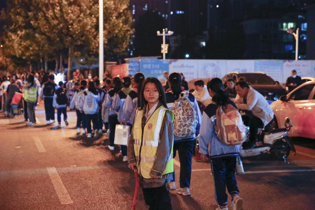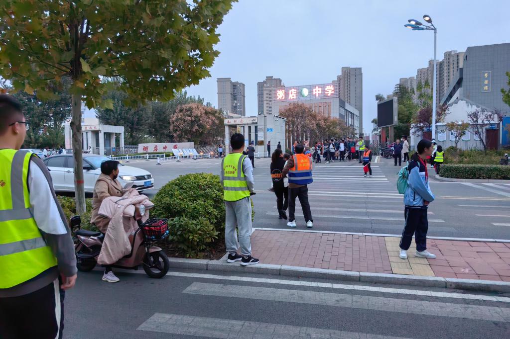 放学时段,志愿者引导车辆避让学生。