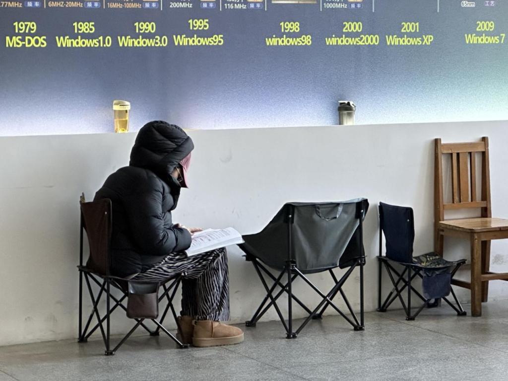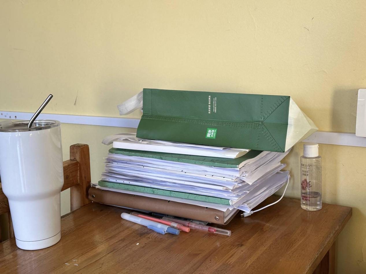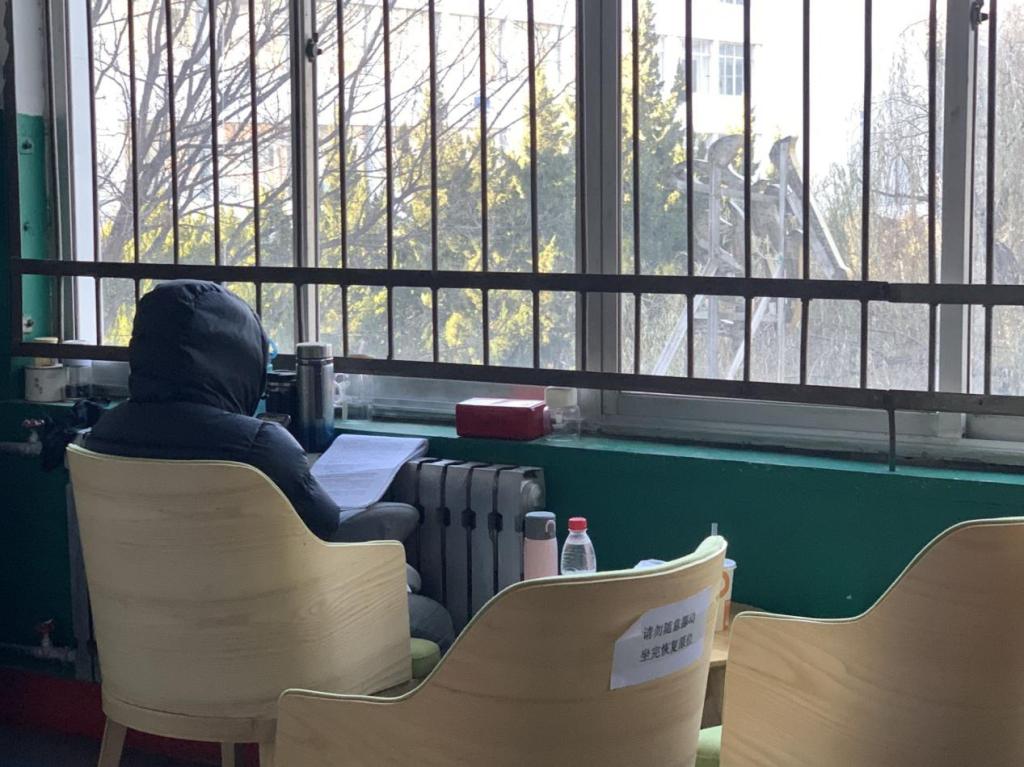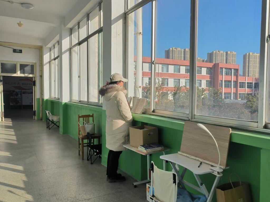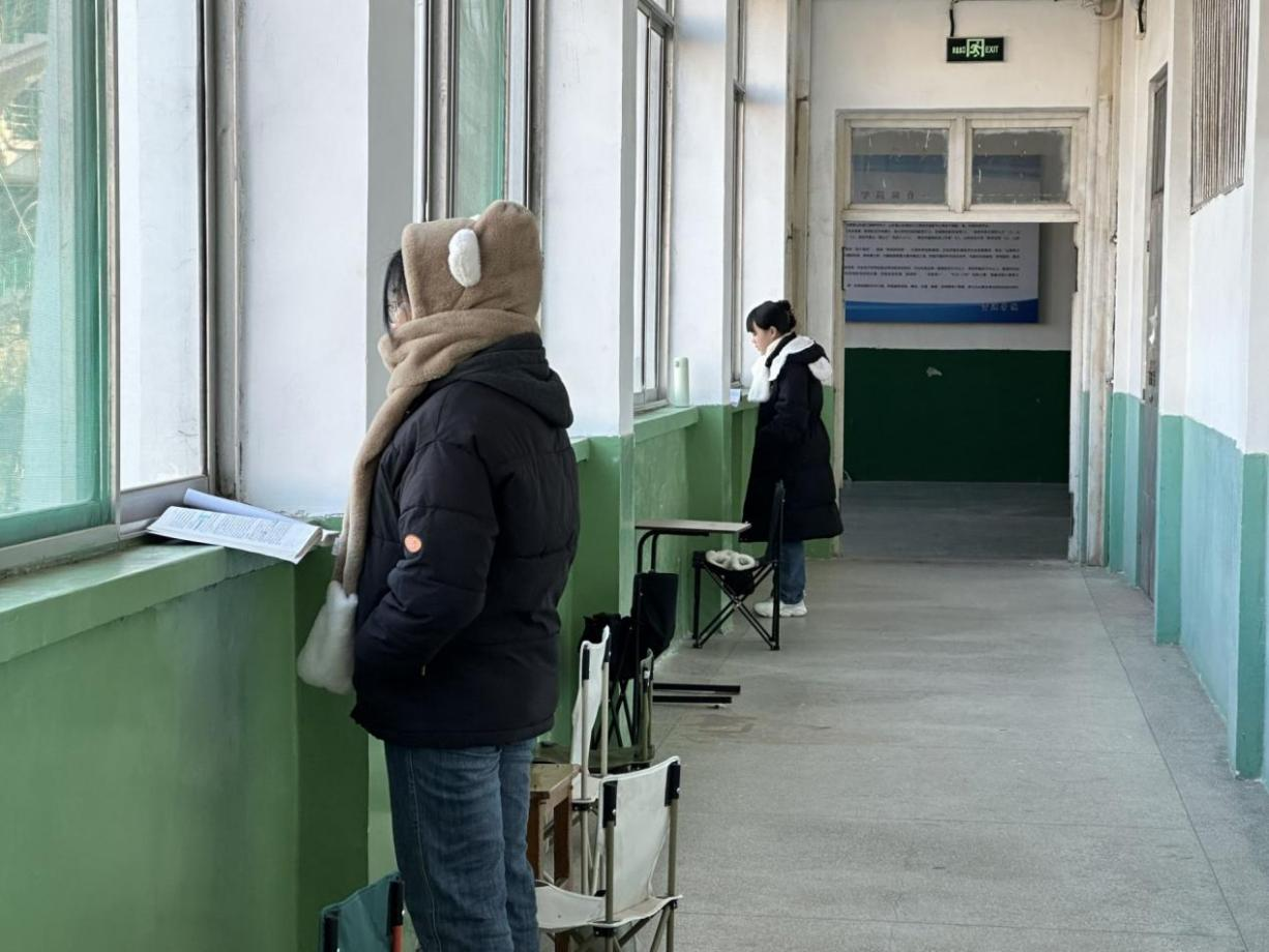 下午,考研学生在学校的角角落落里撑起凳子,他们在走廊奋笔疾书,在鹰湖旁大声背诵,校园里所有可以学习的地方都可以看到备考学子留下的学习资料。