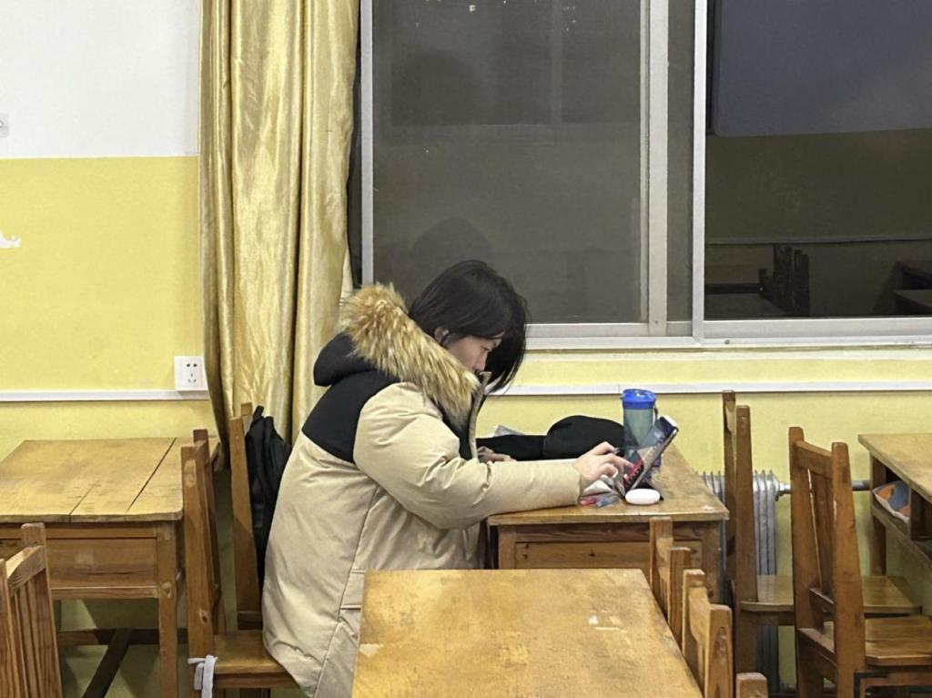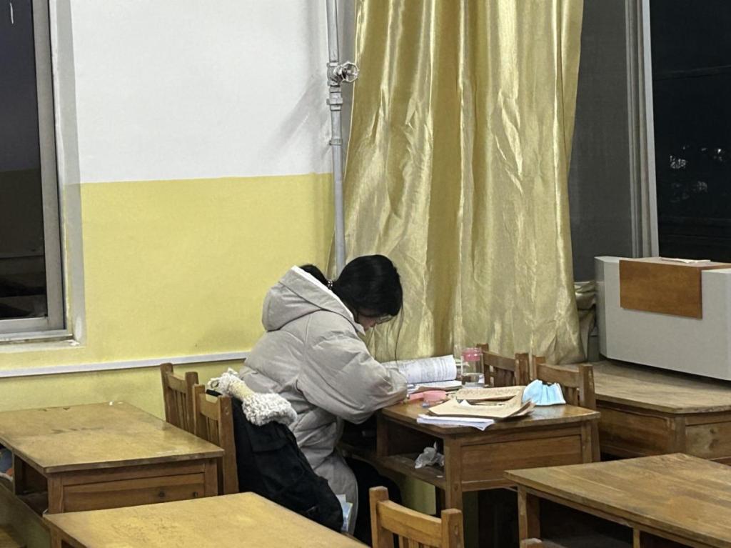 晚上,天已经黑下来,财院备考学生仍然在教室认真汲取复习知识,即使夜已深也绝不松懈。
