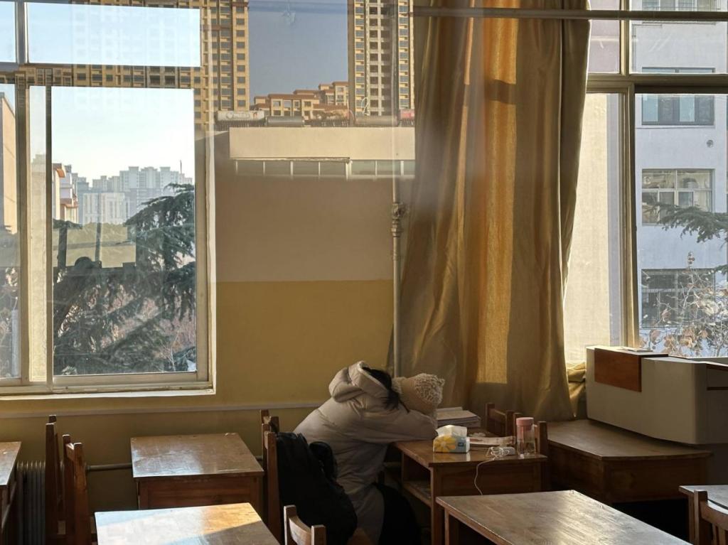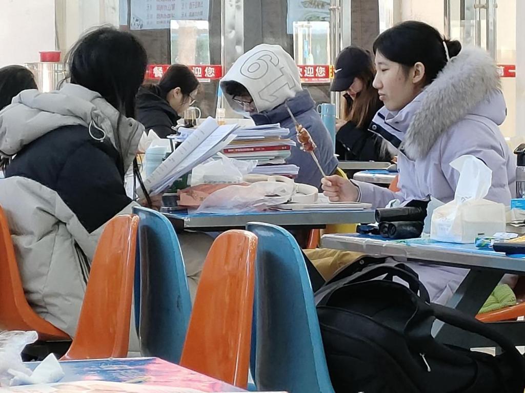 中午,备考生在餐厅快速解决午餐,挤出一点一滴的时间学习,趴在桌子上简单休息恢复精力。
