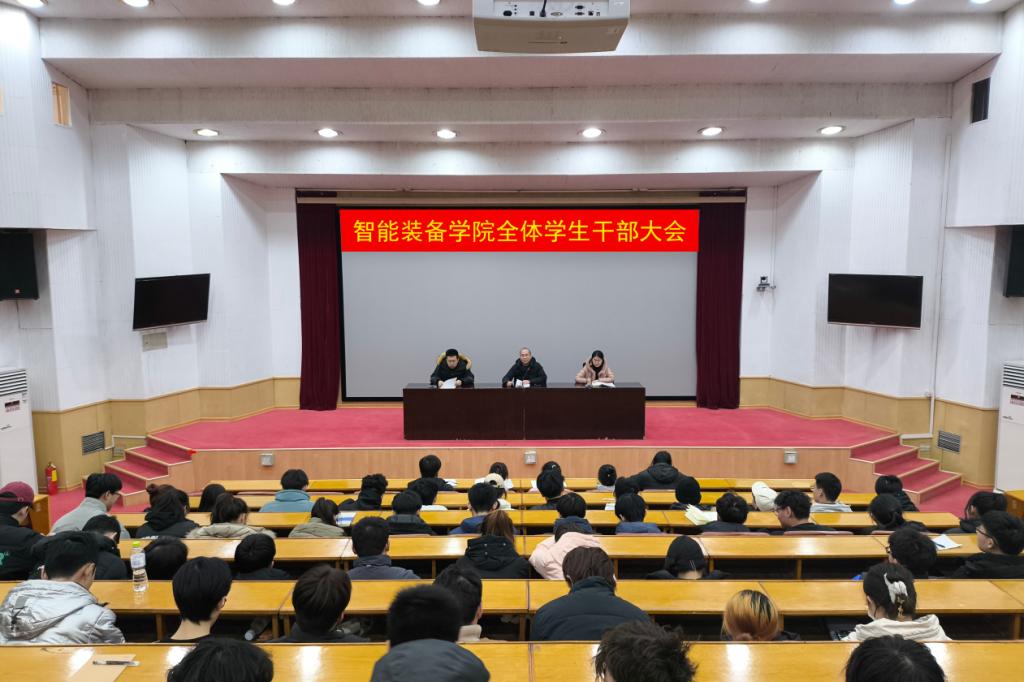 为进一步落实学院新学期有关学生工作的部署和安排,提高学院学生干部的综合能力,2月25日,智能装备学院在东校园4号楼报告厅和西校园2102召开学生干部大会。学院党委副书记兼副院长裴国栋,学院学生工作办公室主任、团委书记谢清勇,全体辅导员、各班级以及学生会主要学生干部参加会议。会议由辅导员郭艳培和曹园老师主持。