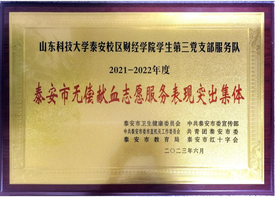 感恩奉献,致敬爱心。为弘扬互助、友爱、奉献、进步的志愿服务精神,每年的献血车进校园活动,财经学院学生党支部服务队都会派出志愿者进行相关志愿服务。志愿者会在活动前进行无偿献血知识的宣传讲解,在活动中维持好献血场所的工作秩序,在活动后询问和记录献血者对献血服务的建议和意见。财经学院学生第三党支部服务队因在无偿献血志愿服务中的突出表现,获“2021-2022年度泰安市无偿献血志愿服务表现突出集体”荣誉称号。