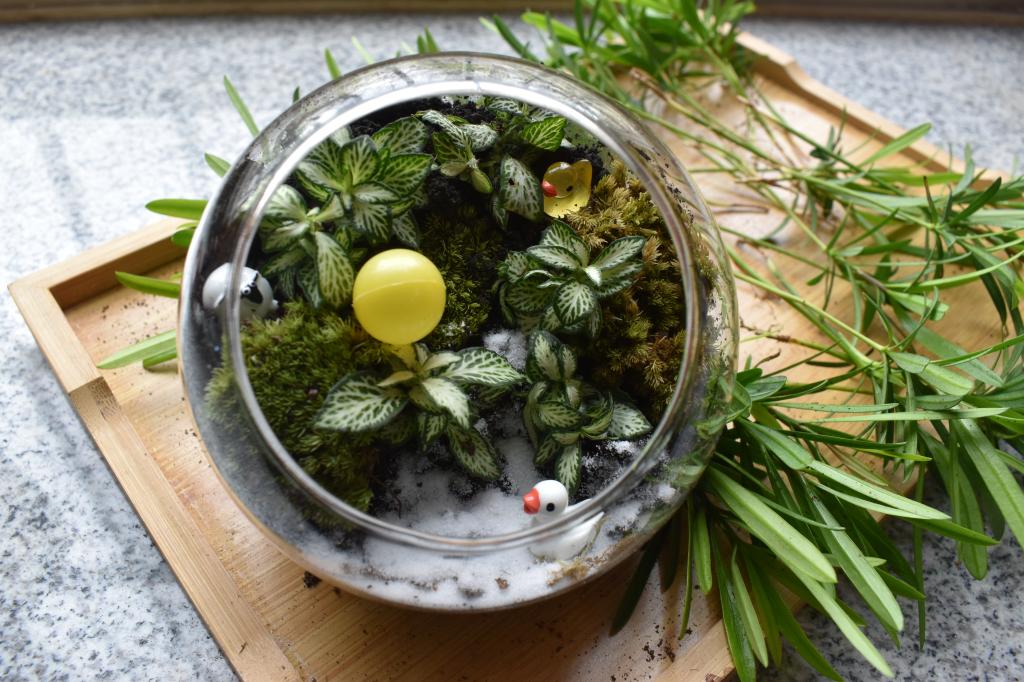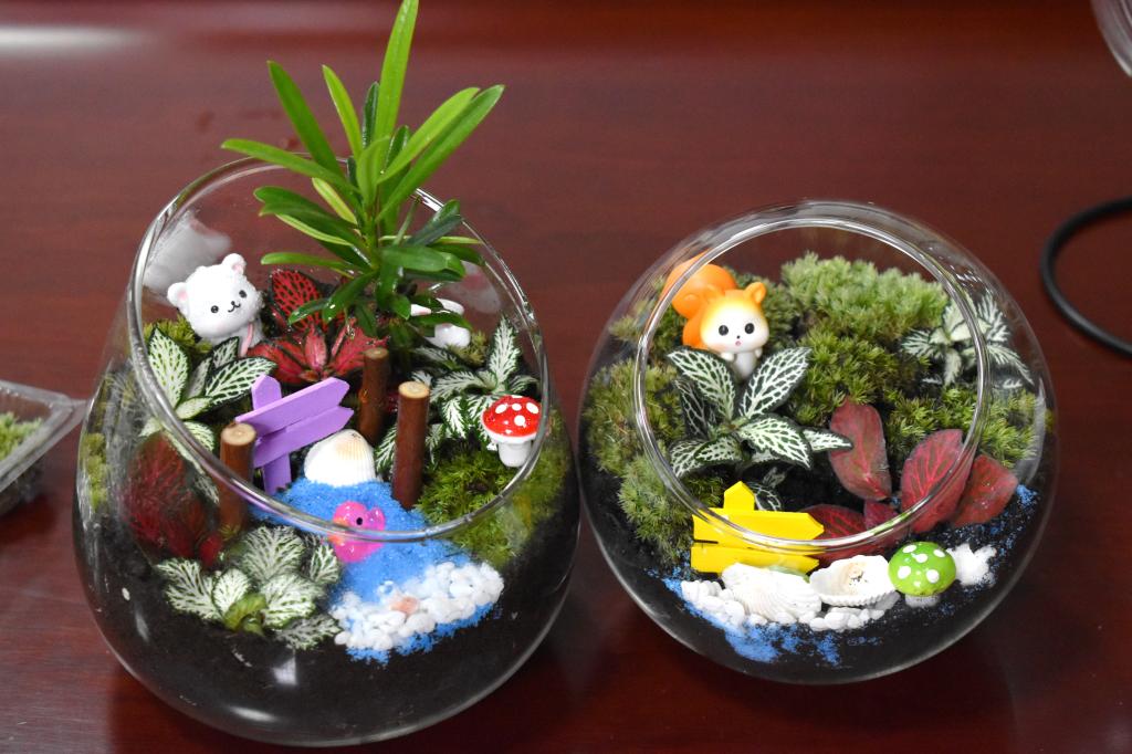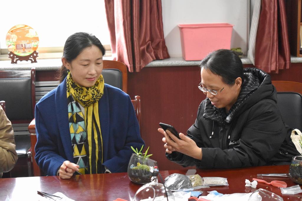 在花艺师的指导下,女老师兴趣盎然、指尖造趣,纷纷发挥想象动手制作。生机勃勃的观叶植物、绚丽的彩色砂石、萌动的装饰小玩偶,这些在平时毫不起眼的小东西,在大家的巧手摆放下,在玻璃器皿中焕发出了不一样的生命力,一幅幅微缩景观、一个个妙趣横生的小世界尽显浓浓春意。