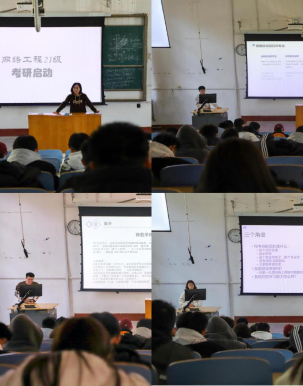 网络工程专场中,以刘颖超,卜文琦,时雨为代表的考研优秀学生从自身实际情况出发,讲述了自己在考前择校、专业选择、各课程的复习、考研资料、备考工具等宝贵的经验。面对学习过程中的枯燥和考试带来的压力,他们希望同学们要学会及时调整心态,始终坚守自己的目标和梦想。得益于同学们积极提问的热情,活动现场的气氛逐渐升温,学长学姐们也慷慨地为在场的同学们提供了解答和指导。