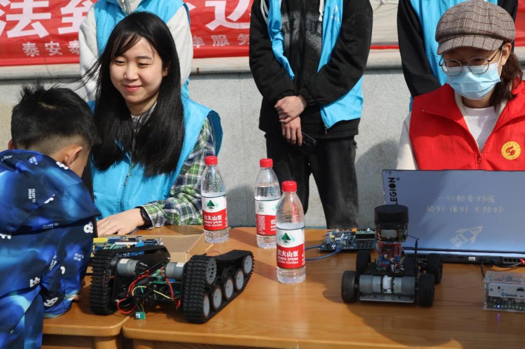 近日,智能装备学院联合泰前街道办事处司法所在泰山区泰前街道林校操场举办了科普进社区社会实践活动。智能装备学院大学生志愿者参加活动。