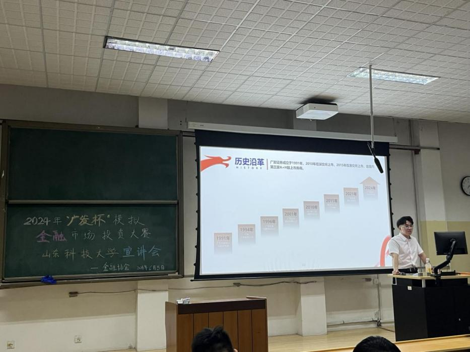 为推动高校理论体系与实际操作能力的融合,加强在校大学生树立理性、科学的投资观念。6月5日晚间,金融协会邀请了广发证券区域经理孙新和区域经理助理王曦露,于教学楼W3101进行2024“广发杯”模拟金融市场投资大赛宣讲活动。出席活动的有23级金融科技班级学生以及学校金融协会成员,会议现场同学们积极聆听,气氛热烈。
