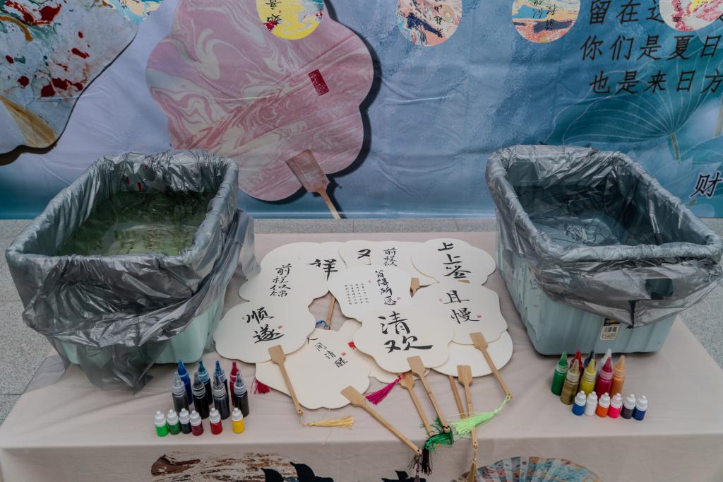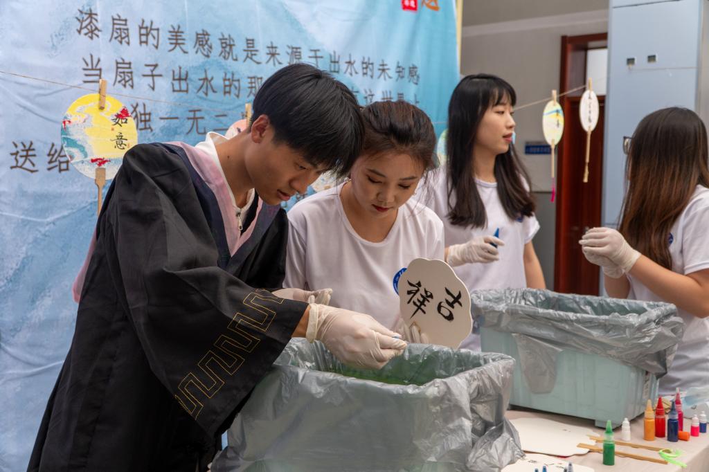 活动现场,毕业生们笔蘸墨汁,随着笔尖轻轻滑过,在扇面写下“前程似锦”“未来可期”“奔赴山海”“所得皆所愿”等祝福语,寄托着对未来的憧憬和期待。随后,挑选起自己喜欢的漆色,将各色颜料滴入水中,渲染开的彩色漆膜晕染出独特的图纹,将纸扇斜插入水中,轻移旋转,缓缓抽出,水流动的波纹与漆液轻盈晕开的脉络交相融合,为扇子覆上独特的色彩和图案,有的如绿水青山,有的像漫天红霞……