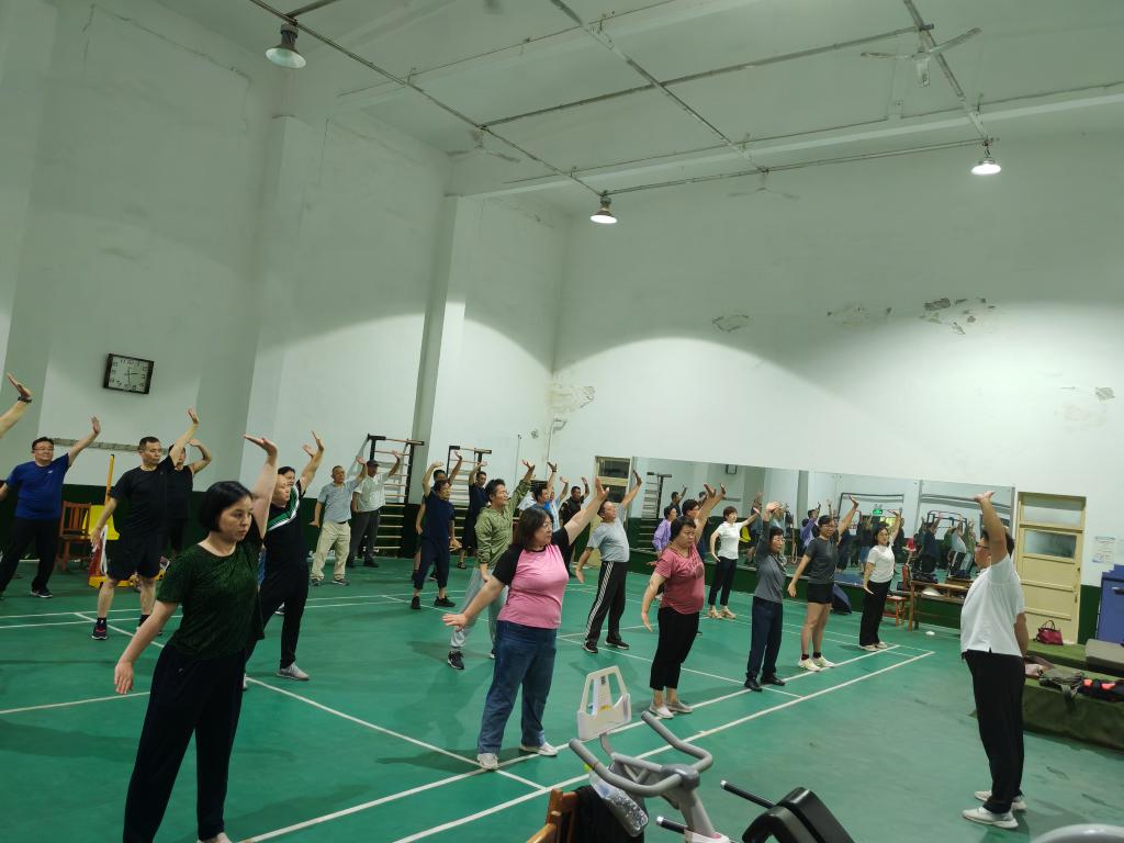 集中活动现场,朱元明带领大家进行了运动前的热身活动和运动后的髋膝踝关节周围肌肉的精准拉伸;王仲春开展八段锦3-4式教学;两位老师还为大家讲解了健身器材的科学使用方法。