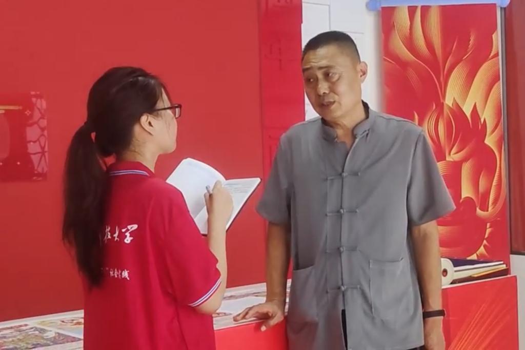 最触动人心的时刻,莫过于与非遗传承匠人的面对面交流。实践团来到了永兴和老字号拜访了杨乃东老师,杨老实杨家埠百年老字号“和兴永年画店”第十八代传承人,杨家埠木版年画省级非物质文化遗产代表性传承人。他用平实而深情的话语,分享了自己对木版年画毕生的追求与坚守,以及面对现代市场与传统文化碰撞时的困惑与思考。这份对传统的热爱与执着,深深感染了我们每一个人。
