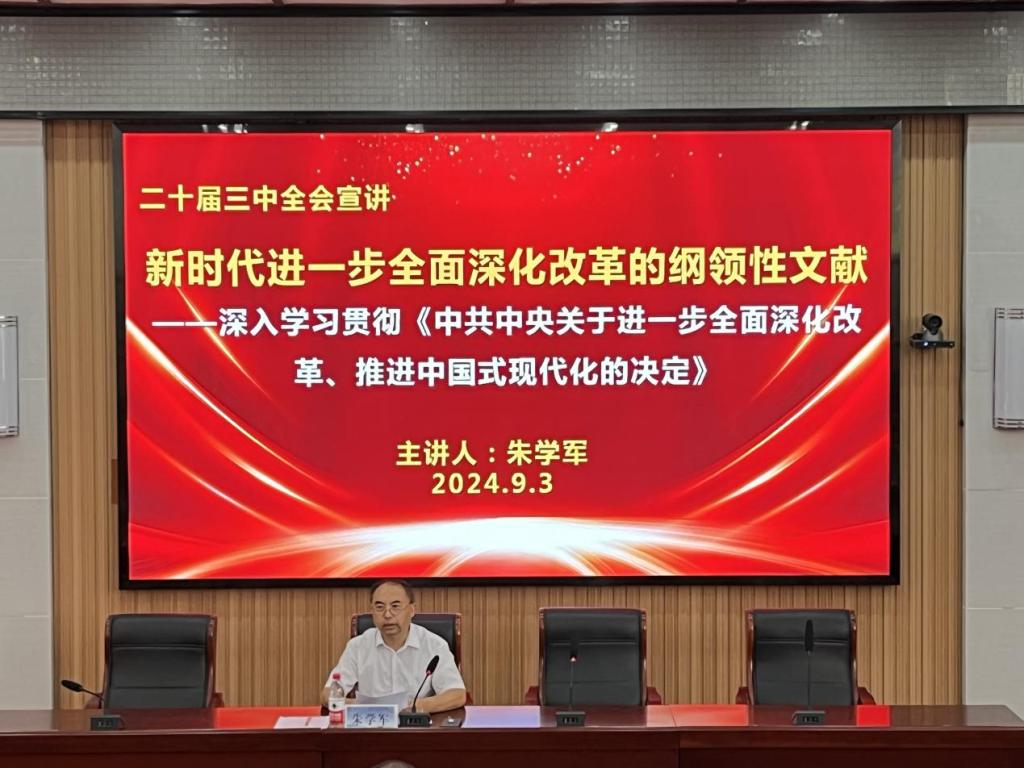 会上,朱学军紧紧围绕进一步全面深化改革、推进中国式现代化这一主题,从牢牢把握进一步全面深化改革的意义、总目标、主题、重大原则、重大举措、根本保证和需要坚守的底线等七个方面作了系统宣讲和深入阐释。