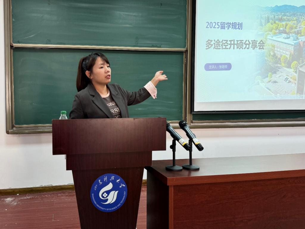 张静以“多途径升硕”为主题,以出国留学的优势为切入点,从中外合作办学项目、留学国家推荐、院校选择标准、留学申请时间和获得录取的方案等方面进行了详细讲解。通过剖析往年山科学子出国留学的典型案例,加深同学们对留学申请的了解。最后,张静耐心解答了在场同学关于出国留学的相关问题,并鼓励大家把握机会,认真准备,争取“申硕”成功。