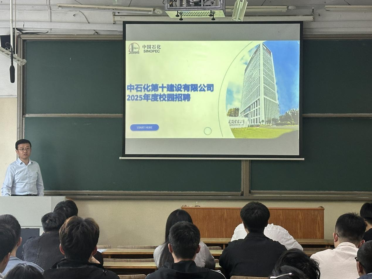 会上,中石化第十建设有限公司人力资源部副总经理陈广良对企业发展历程、企业文化、业务范围以及未来发展规划进行了详细阐述。他表示,公司十分重视人才组织建设,近年来在智能装备、自动化控制、信息技术等领域拥有广泛的人才需求以及良好的职业发展前景。他希望同学们详细了解公司的用人标准和职业发展路径,并积极投递简历,实现个人与企业的共同成长。同学们围绕薪资待遇、职业规划等内容进行提问,陈广良逐一解答并分享了青年人在职场发展的相关建议。