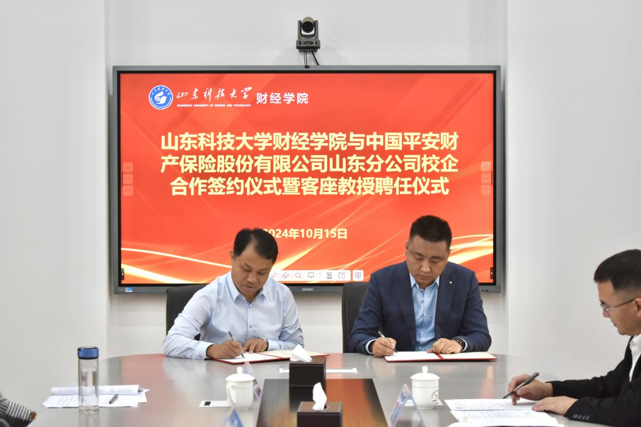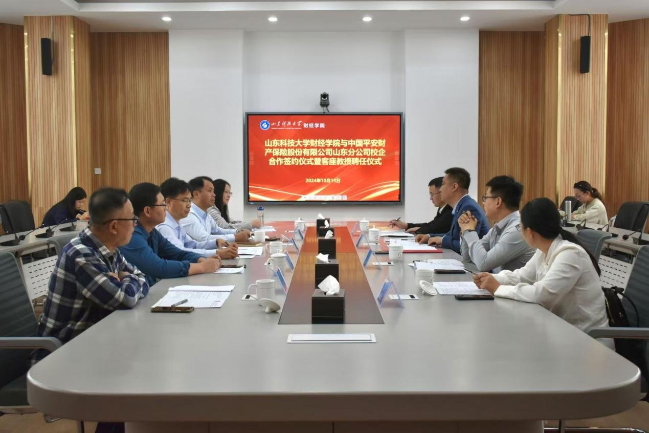 10月15日下午,财经学院与中国平安财产保险股份有限公司山东分公司于办公楼201会议室举办了校企合作签约仪式暨客座教授聘任仪式。出席此次仪式的有中国平安财产保险股份有限公司山东分公司副总经理郑学军、线上客户部总监刘玉宁、人事行政部徐春杰,财经学院党委书记陈炳志、院长刘庆志、副院长主父海英、财政金融系主任亚春林,会议由副院长宗科主持。