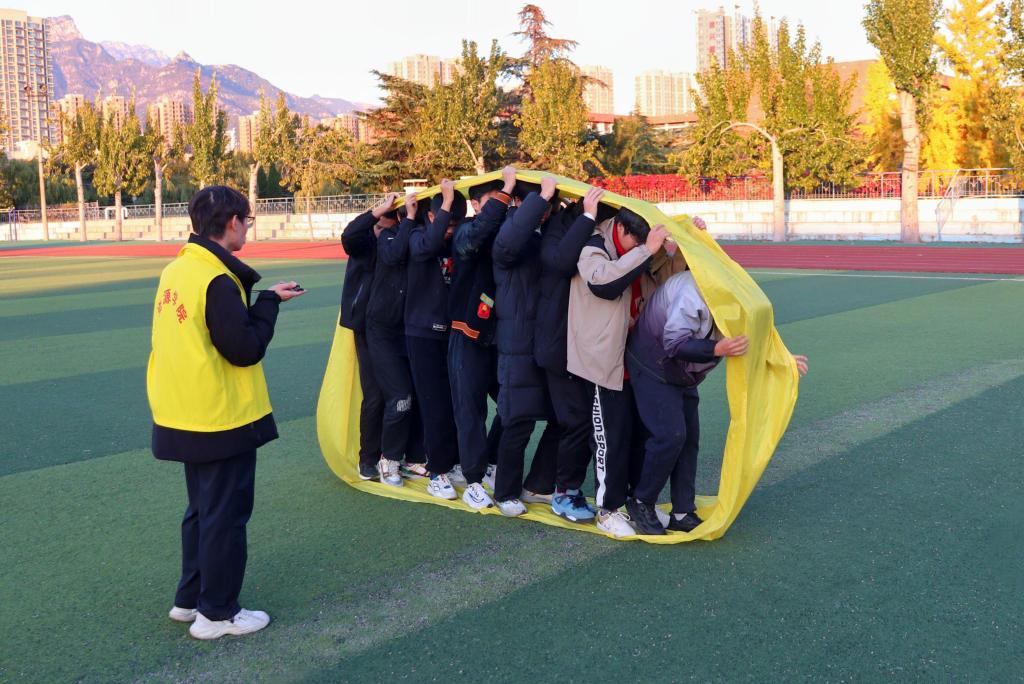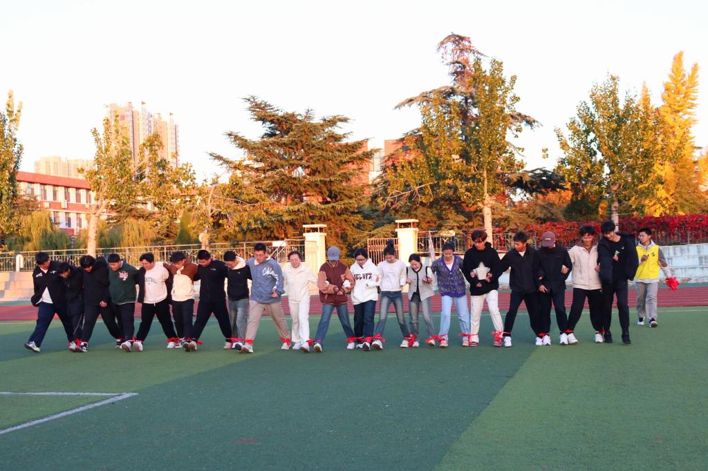第一阶段分为“十人九足”“旋风跑”“一圈到底”和“车轮滚滚”四个环节,按照累计时长进行成绩排名。在“十人九足”环节中,20名同学排成一横排,相邻两人将腿绑在一起,共同前进,同学们步伐整齐划一,在响亮的口号中稳健前行;在“旋风跑”环节中,5名同学共握一根长杆,步伐协调、紧密配合,同步跨越多重障碍,敏捷绕过立杆,彰显了身体的灵巧技艺;在“一圈到底”环节中,15名同学手拉手呈一字排开,每位同学依次通过呼啦圈,同学们密切协作、奋力传递;在“车轮滚滚”环节中,8名同学有序进入履带中,一人带动引领,其余紧密相依、协同前行,大家齐心协力、默契十足、奋勇向前,平稳完成挑战。