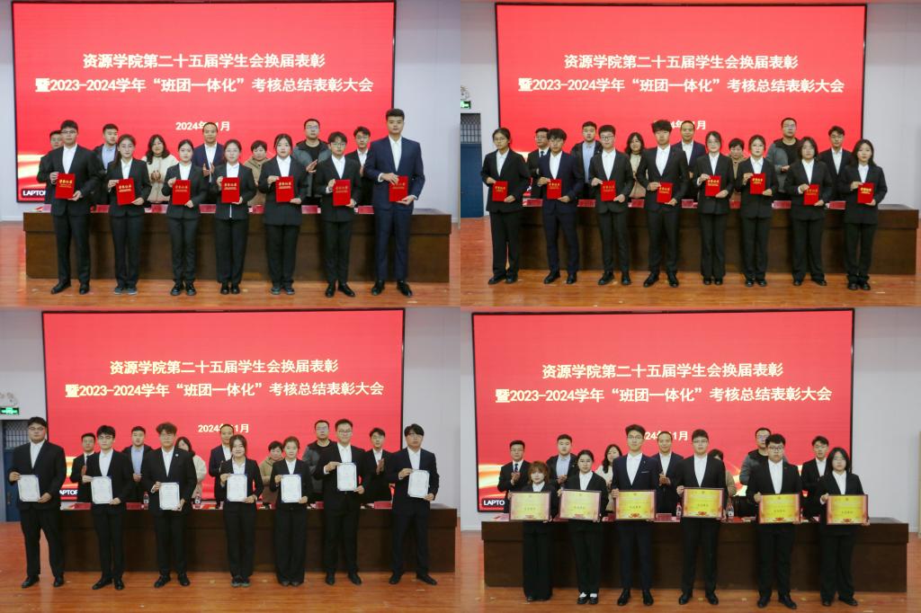 会上,洒艳宣读了《关于表彰资源学院第二十五届学生会优秀干部、优秀志愿者的决定》,辅导员牛会功宣读了《关于表彰资源学院2023-2024学年“班团一体化”考核工作先进集体的决定》。在热烈的掌声中,受表彰的学生会优秀干部、志愿者代表以及先进集体代表依次上台领奖。辅导员卢业美宣读了《资源学院第二十六届学生会干部名单》,出席老师为学院第二十六届学生会主席团成员颁发聘书。