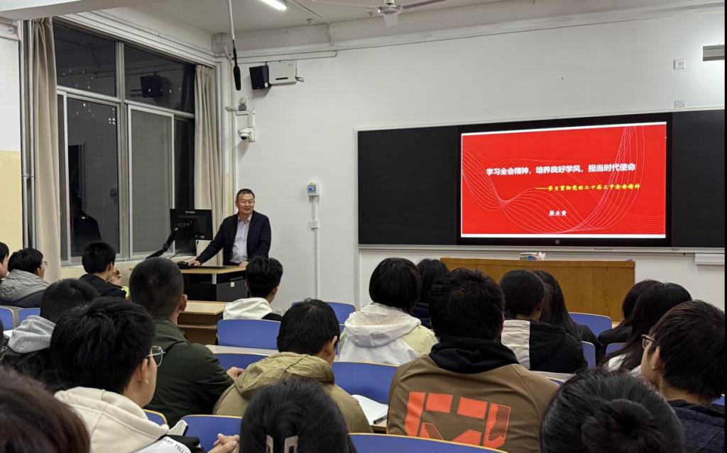 11月20日,校党委组织部副处级组织员,泰安校区机关党总支书记殷永贵受邀为智能装备学院网络工程2024级4、5班宣讲党的二十届三中全会精神。