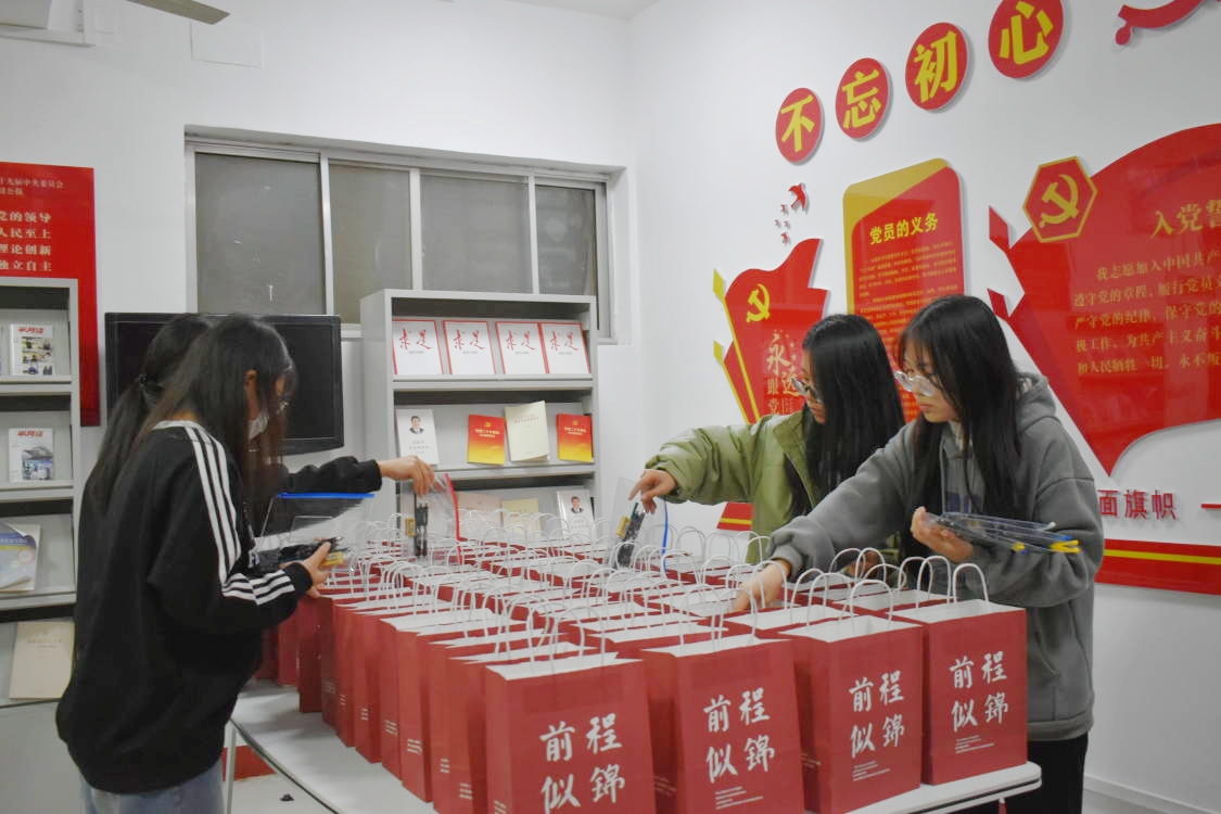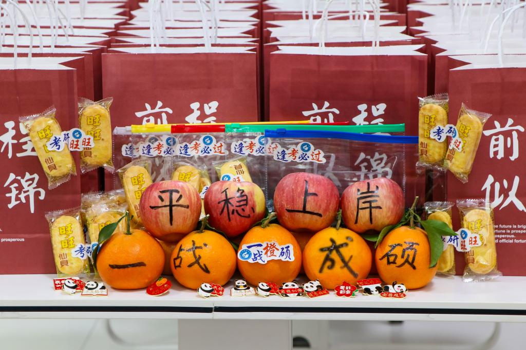 财经学院为考研学子们精心准备了“考研大礼包”。礼包中有实用的“逢考必过”一应俱全文具袋、联想“考研旺旺”的旺旺小零食、寓意“平稳上岸”的苹果、谐音“一战成硕”的脐橙、印有“金榜题名”、“未来可期”等寄托着对考生前程美好祝愿的徽章……一份份礼包排成“上岸”字样,祝愿考研学子在考试中旗开得胜、成功“上岸”。
