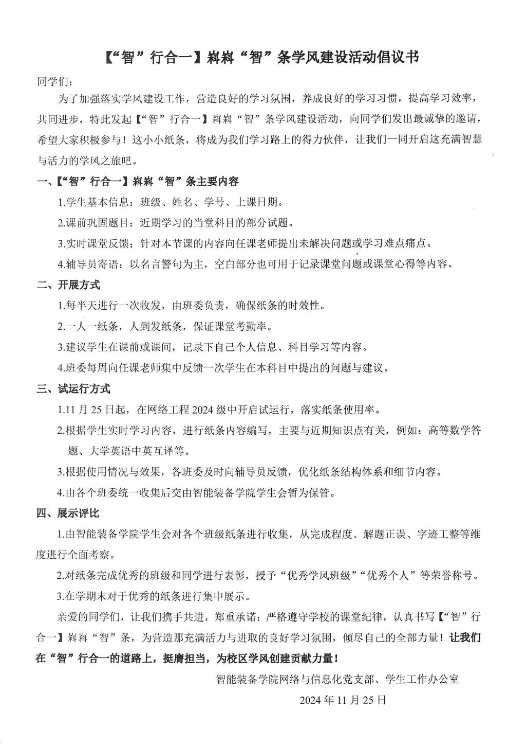 11月25日,为把校区学风建设动员和推进会有关要求落地落实,智能装备学院部分教工和学生党支部联学共建,共同发出了【“智”行合一】嵙嵙“智”条试行倡议。