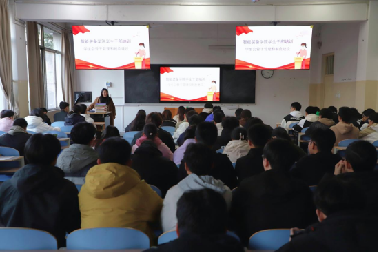 11月22日,智能装备学院在西校园2108教室举办了第三期学生干部培训会,学院团委副书记曹园担任主讲,西校园学生会各部门主要成员参加。