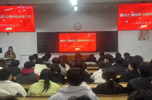 韩晓旭结合学院近期十大优秀学生、十佳班级评选取得的优异成绩,借助学院先进班集体建设的优秀案例,深入分析打造优秀班集体的现实价值和重要意义。她分享了特色班级建设的几点经验。一是要立规矩,聚焦制度建设,夯实工作基础。严要求树立底线思维,形成共同遵守和相对稳定的班级建设制度,为班级建设打下坚实基础。二是要聚合力,聚焦队伍建设。提升工作能效,凝心聚力带领班级形成良好风气。三要展风采,聚焦特色工作,抓好工作重点。主动凝练、寻找班级工作特色,结合学院优势和专业特点在学风建设、科技创新、社会实践等方面重点建设,形成独具风采的班级特色工作体系。