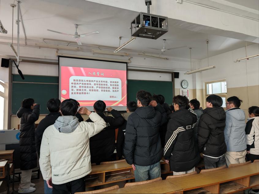 入团仪式在庄严的国歌声中拉开序幕。全体师生肃立,齐唱国歌,歌声嘹亮,振奋人心。随后,何颖宣读了新团员名单,共有32名学生经过严格考察与审核,光荣地加入了中国共产主义青年团。辅导员为新团员佩戴团徽并颁发团员证,团支部书记刘培德带领全体新发展团员庄严宣誓。