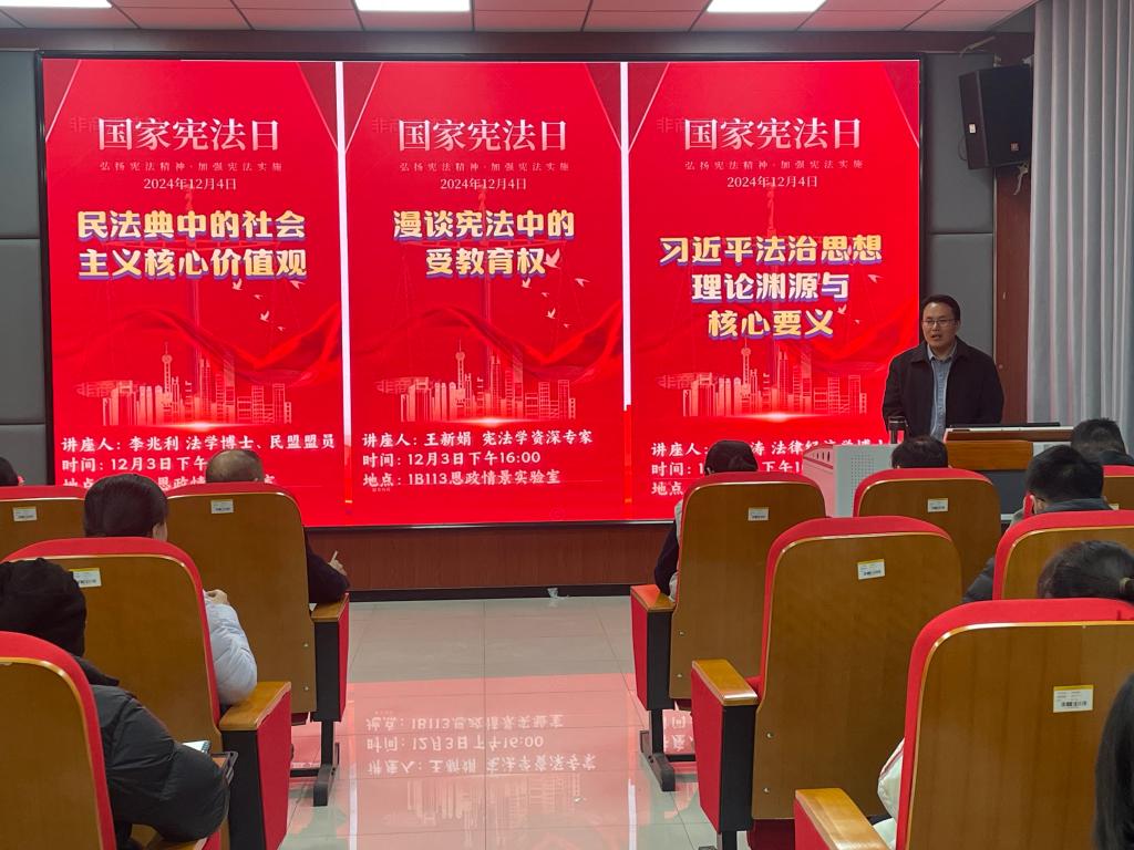 为深入学习贯彻习近平法治思想,大力弘扬宪法精神,增强师生法治意识,推进普法宣传教育,12月3日下午,由泰安市社会科学普及教育基地、3044永利集团官网联合主办,民盟3044永利集团官网委员会协办,3044永利集团官网政法系承办的12.4宪法宣传周系列学术报告会在思政情景体验教学中心举行。3044永利集团官网党委书记兼主任朱学军及3044永利集团官网理论学习中心组成员、校区各学院学生代表参加报告会并进行现场交流。报告会由政法系党支部书记、主任桑爱友主持,学部佀连涛、王新娟、李兆利三位教师作了专题报告。