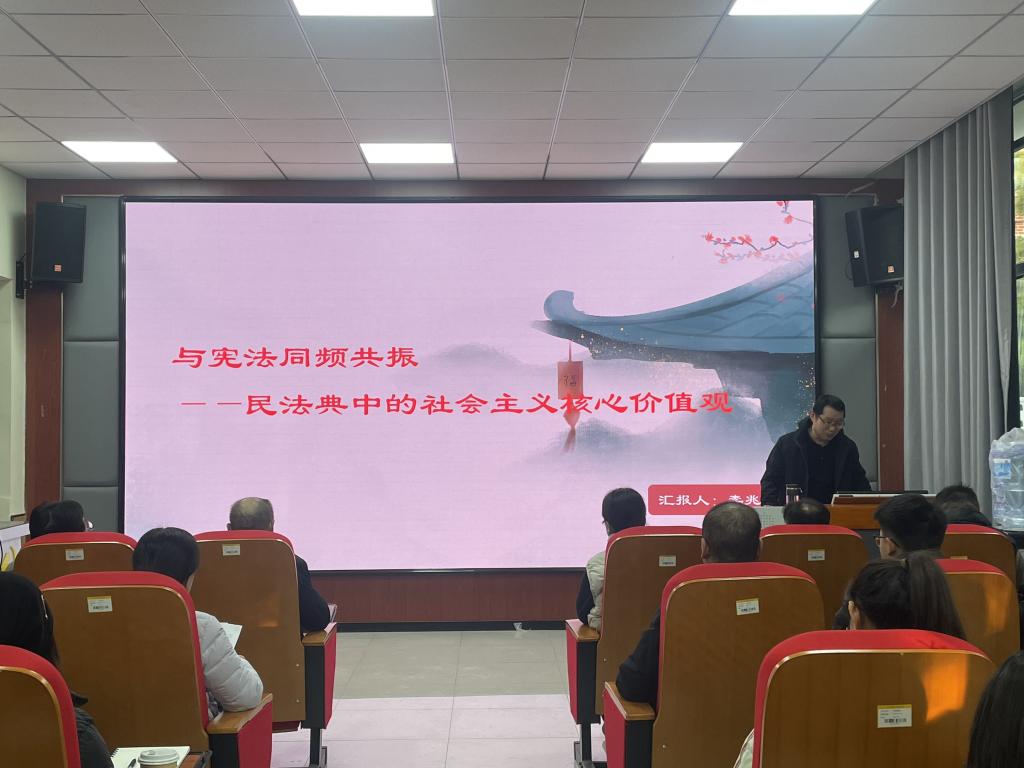 李兆利老师以“民法典中的社会主义核心价值观”为题,阐述了社会主义核心价值观与民法典的渊源,分析了社会主义核心价值观在《中华人民共和国民法典》中的文字表达和制度表达。随后,通过分析“侵害英雄烈士名誉权纠纷”、“离婚冷静期”“高空抛物”等具体案例,向大家生动形象地讲述了社会主义核心价值观融入民法典的具体体现。