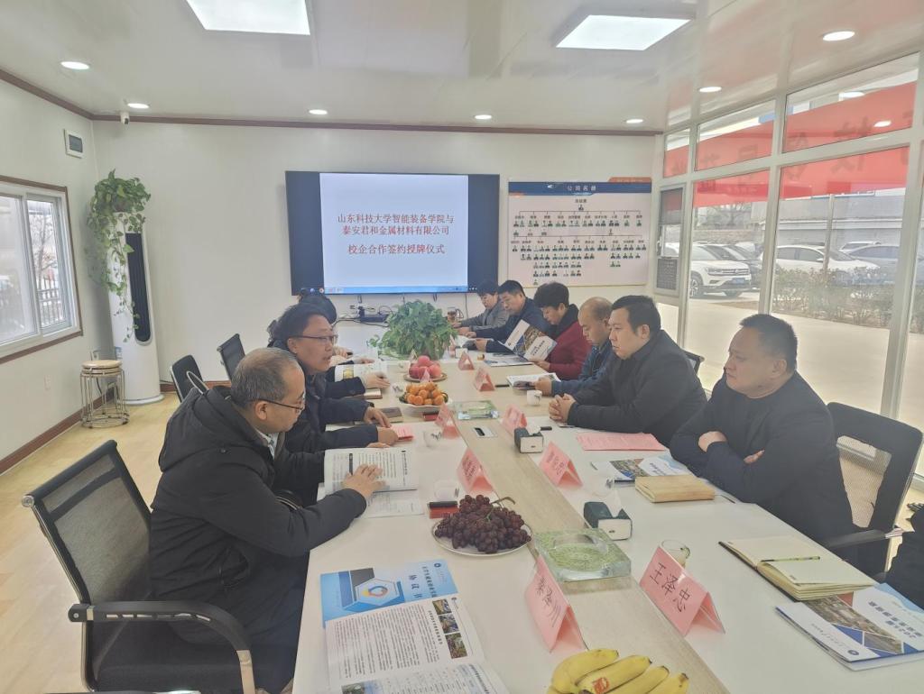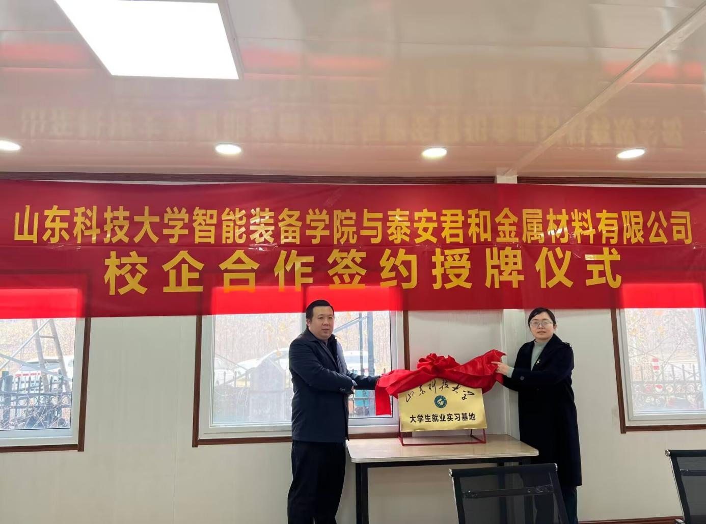 12月10日,智能装备学院党委副书记兼副院长王衍国、副院长娄淑梅、团委书记谢清勇一行5人到泰安君和金属材料有限公司进行访企拓岗并举行大学生就业实习基地签约授牌仪式。泰安君和金属材料有限公司总经理唐磊等接待了王衍国一行。