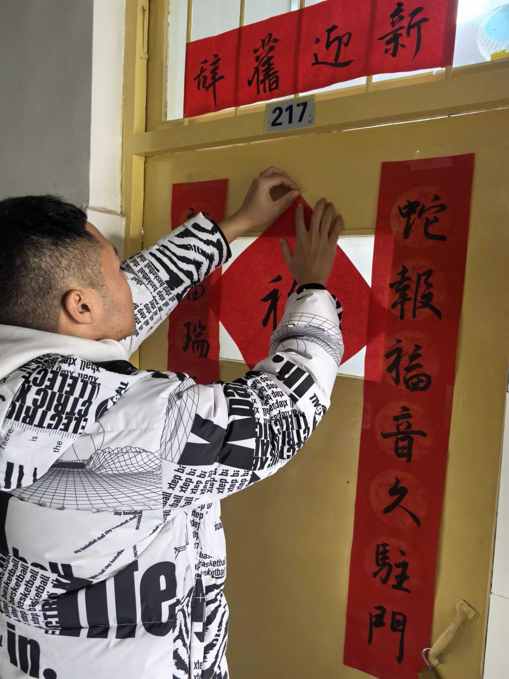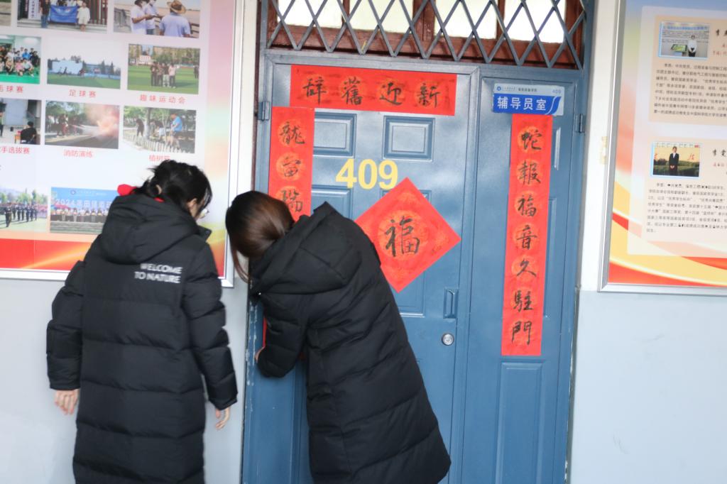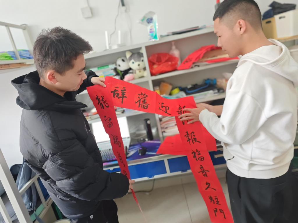 据悉,黄子博同学自幼爱好书法艺术,经常临帖练字。元旦假期,他选定寓意吉祥、富有节日气息的春联内容,将美好的祝愿凝聚于笔尖,书写了一副副春联作品,并赠送给老师和同学们。这些春联被张贴在辅导员办公室、学生宿舍,不仅传递了节日的祝福,更拉近了师生之间的距离,让大家在忙碌的学习生活中感受到了浓浓的年味和同窗的友情。