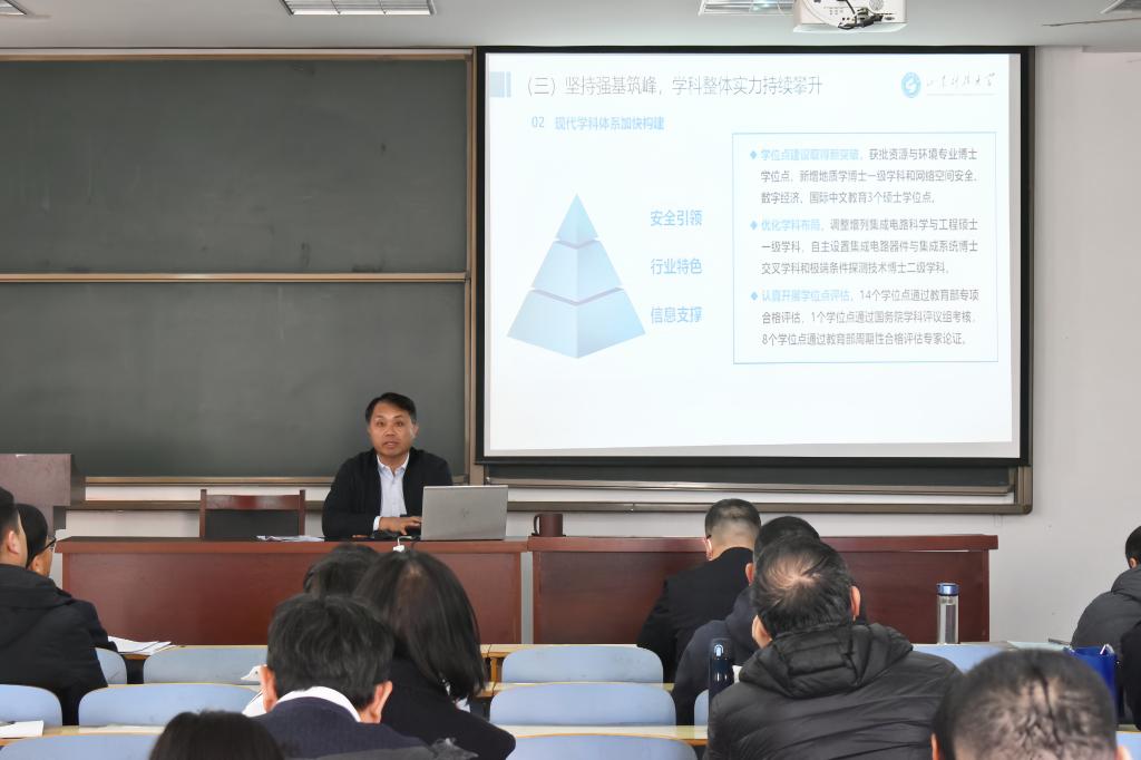 院长刘庆志传达了曾庆田校长在年度工作会议上的工作报告精神和相关要求,并结合学校年度工作会议精神,从党建、本科教育教学、科研和学科建设、学团工作、基地和师资队伍建设等方面,对学院2024年各项工作进行了全面总结,对2025年工作进行了详细部署。他指出,2025年是“十四五”规划收官之年和学校“双一流”建设关键年,是面向“十五五”新征程谋划承担教育强国建设重任的战略发展之年,全体教职工要找准学院在学校“双一流”建设中的角色定位,全面落实学校2025年工作要点提出的目标任务,充分利用学校特色文科振兴行动计划等相关政策,力争在学院工作的各个方面形成标志性成果。
