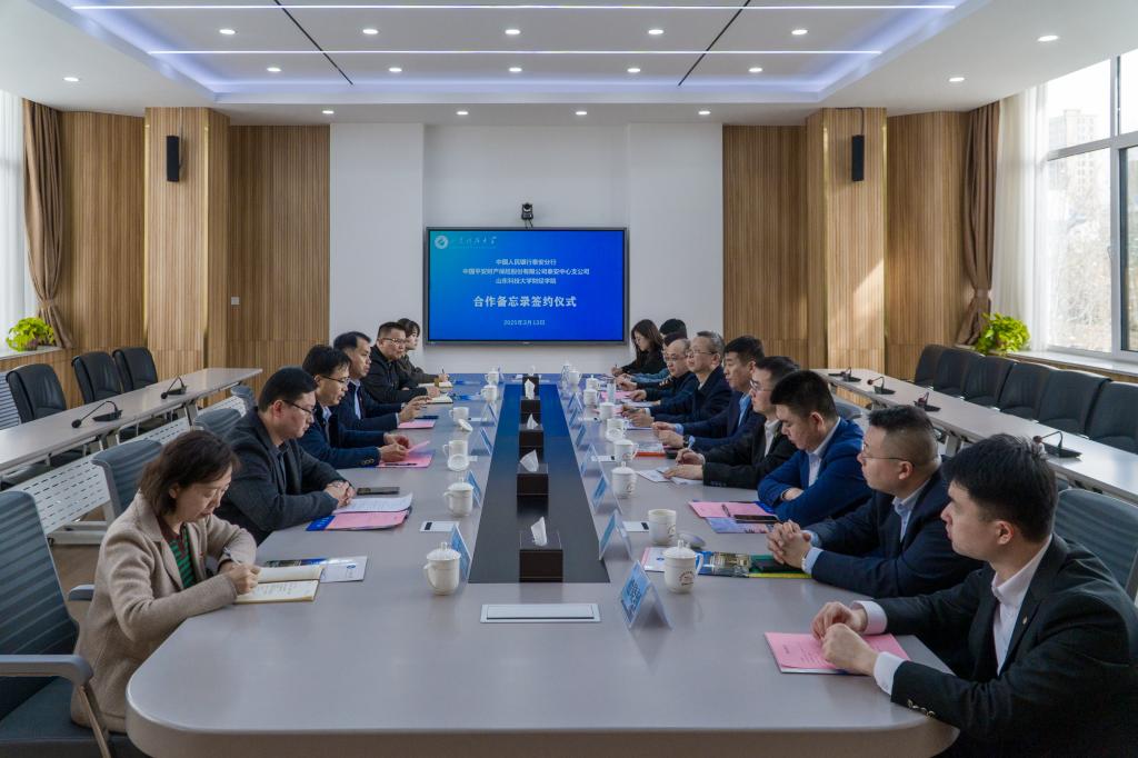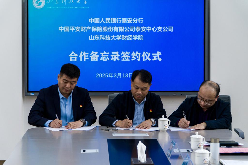 为深入贯彻落实党的二十大和二十届三中全会精神,探索“党建+业务”深度融合新路径,推动政校企协同创新,服务地方经济高质量发展,3月13日下午,财经学院与中国人民银行泰安市分行、中国平安财产保险股份有限公司泰安中心支公司成功举办战略合作备忘录签约仪式。中国人民银行泰安市分行党委委员、副行长张俊一行五人,中国平安财产保险股份有限公司泰安中心支公司书记周滨一行五人,财经学院党委书记陈炳志、院长刘庆志等出席签约仪式。仪式由财经学院副院长宗科主持。