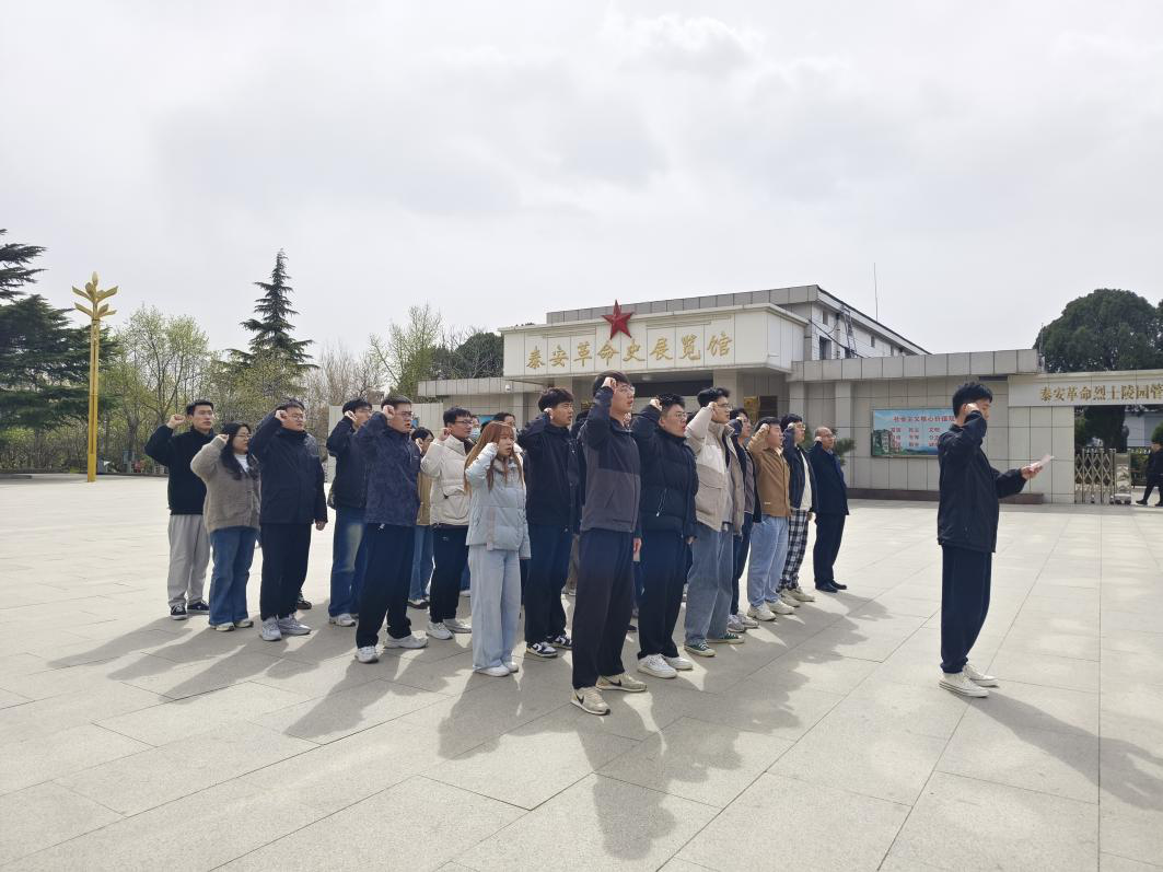 在支部委员的带领下,全体党员面向革命烈士纪念碑庄严列队,高举右拳重温入党誓词。“我志愿加入中国共产党……”铿锵有力的宣誓声在陵园上空回荡,彰显着新时代青年党员继承先烈遗志、勇担时代使命的坚定决心。随后,谢清勇带领全体党员参观烈士事迹展览馆,讲解员生动讲述泰安地区革命先烈抛头颅、洒热血的英雄事迹,当看到泛黄的战地书、破损的皮箱等文物时,党员们驻足良久。