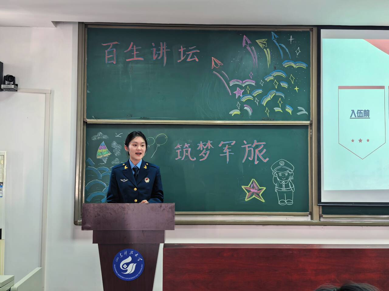 分享会上,来自2022级审计学专业张涵、崔宁芮和王乐三位同学从不同角度展开讲述,呈现出丰富多彩的军旅画卷,充分彰显了当代青年的责任担当。曾服役于三军仪仗队的王乐同学,以“国旗下的每一次心跳”为主题,生动地再现了仪仗兵艰苦卓绝的训练过程;在中部战区空军担任话务员的张涵同学,则以“电波里的战位”为切入点,借助四幅承载着大同驻训珍贵记忆的照片,讲述了在信息化部队中“三尺机台亦是战场”的深刻感悟;来自南部战区海军的崔宁芮同学,通过播放震撼人心的海军宣传片,并结合自己的亲身经历,带领现场观众一同领略了人民海军向海图强的壮阔征程。