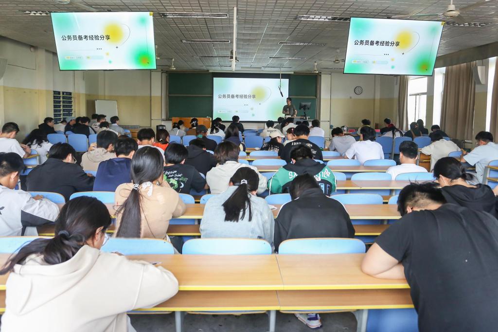 会上,两位主讲人从自身经验出发,结合身边典型案例,分别从考录公务员与军队文职两方面分享经验。在公务员考录方面,毕林林从选岗、备考、心态三方面展开详细分享。选岗时,建议同学们综合考量工作地点、专业对口情况及自身优劣势,慎重选择报考岗位;备考要合理规划并掌握方法;同时注意调整备考心态。军队文职考录方面,曹子玉详细介绍了军队文职概念、岗位类型、薪资待遇等内容,并给出备考建议,推荐备考资料,还分享了应对考试焦虑与压力的实用技巧,助力同学们从容应考。