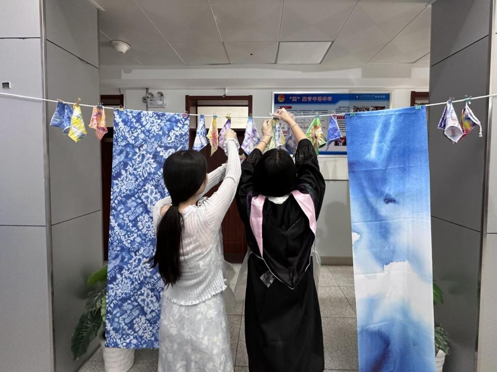 活动上,2025届毕业生们化身“非遗体验官”,将四年青春的感悟与对未来的无限憧憬,倾注于一方素布之上。巧手翻飞间,布料被赋予新生:象征青春绽放的花朵造型、寓意圆满和谐的对称纹样……同学们或独立构思,或合作探讨,在捆扎、浸染、漂洗、晾晒的传统工序中,沉浸式感受扎染的独特魅力。欢声笑语中,一块块色彩斑斓、纹样各异、独一无二的扎染作品逐渐呈现,它们不仅是创意与技艺的结晶,更是青春故事的可视化载体,承载着学子们对母校的深深眷恋。