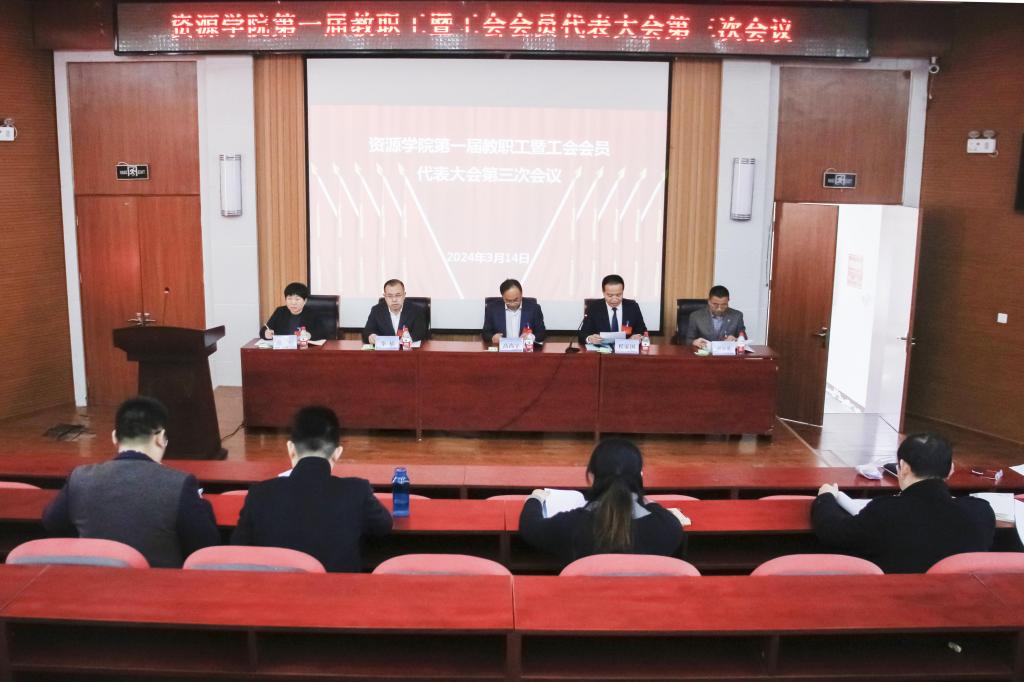 3月14日,资源学院第一届教职工暨工会会员代表大会第三次会议在八角楼召开。会议听取、讨论并审议了副院长李楠所作的学院工作报告和院党委副书记、工会主席程家国所作的工会工作报告,学院党委书记高尚宇作总结讲话。程家国主持会议,19名正式代表出席了会议。