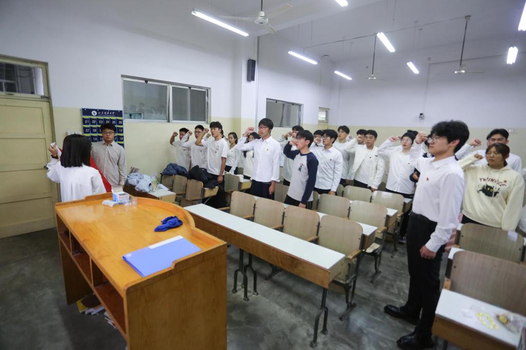 仪式在庄严的国歌声中拉开序幕,全体人员肃立齐唱,现场气氛庄重而肃穆。随后,新团员相互佩戴团徽,面向团旗高举右拳庄严宣誓:“我志愿加入中国共产主义青年团,坚决拥护中国共产党的领导……为共产主义事业而奋斗!”铿锵誓言在教室内回荡,充分展现了新一代团员坚定的理想信念与昂扬的精神风貌。