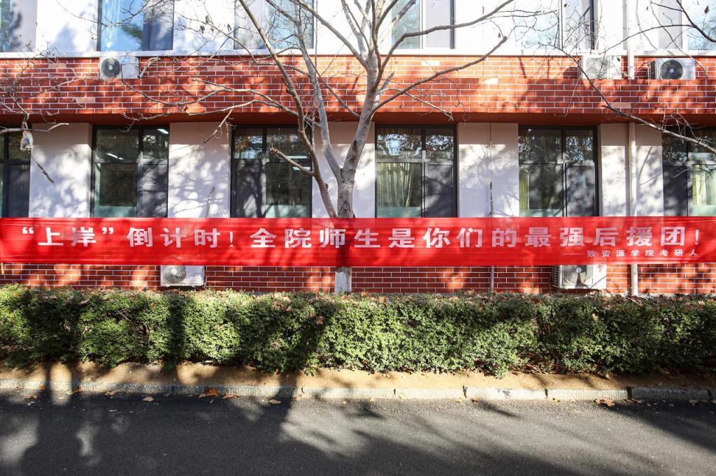 条幅高悬,祝福入心。学院在自习区主干道两侧悬挂了多幅醒目的祝福条幅。红底白字的“执笔为剑,一战成硕”“奋斗今朝,梦想绽放”等话语,如旗帜般高扬在冬日晴空下,既为备考学子营造了振奋昂扬的环境氛围,也以最直接的方式传递出全院师生对考研人的坚定支持与美好祝愿。每一条横幅都承载着温暖的期许,陪伴着学子们走过这段全力以赴的奋斗时光。
