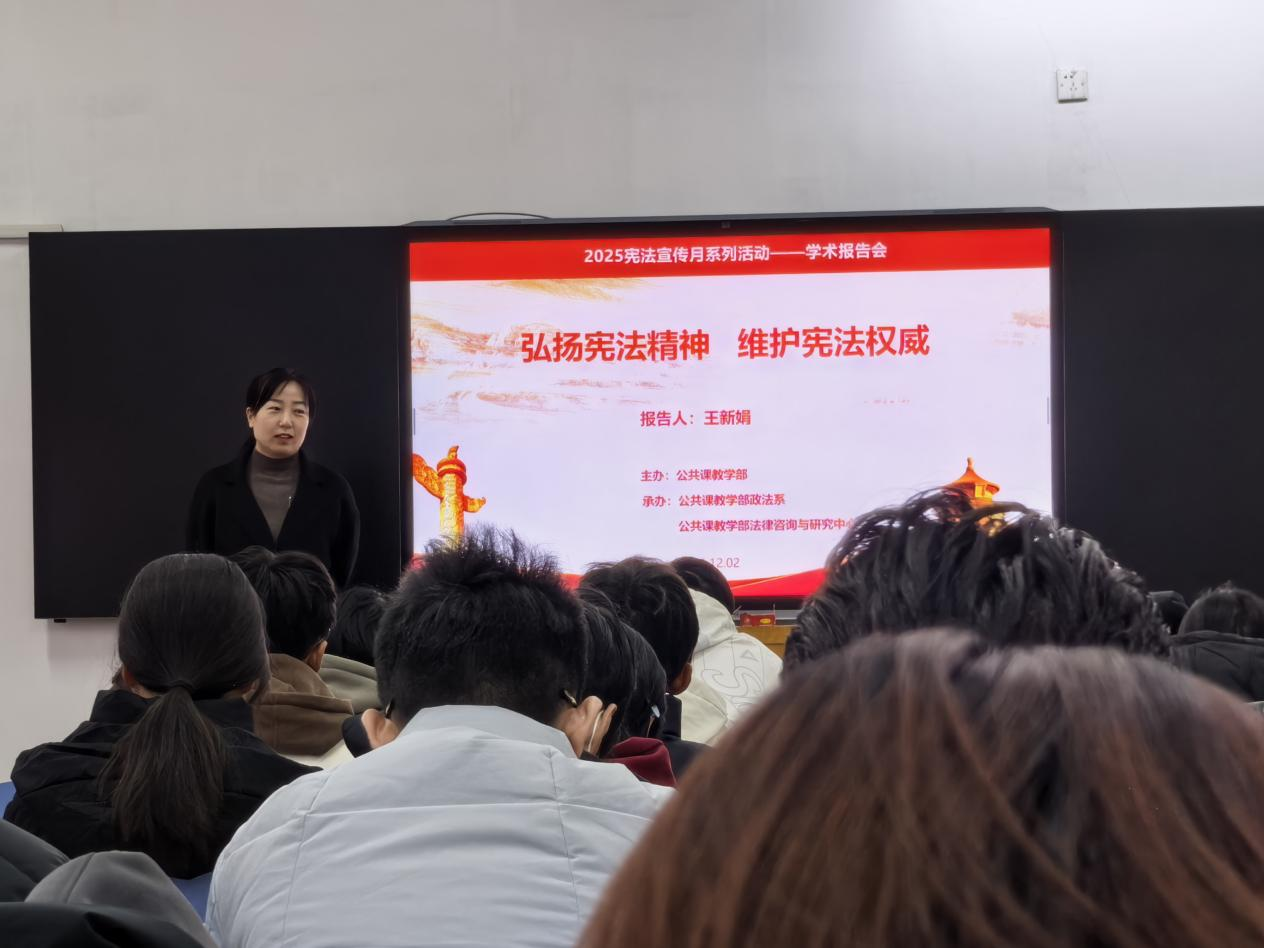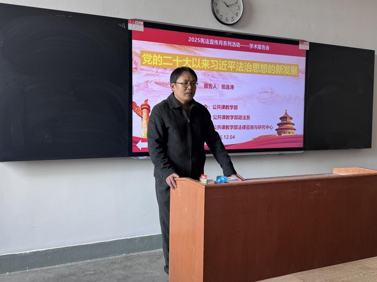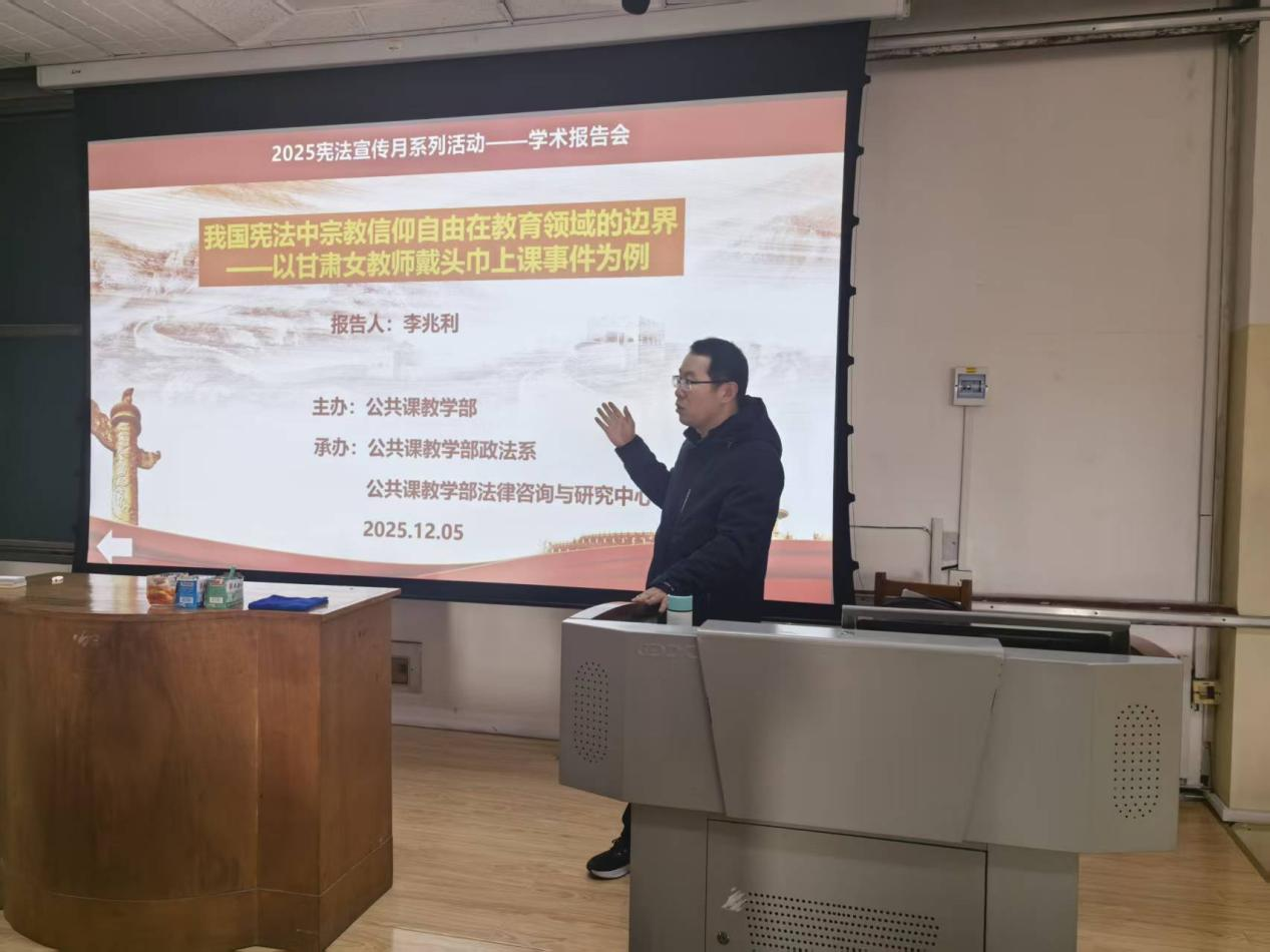 本次宪法宣传月系列活动的核心内容为三场宪法主题宣讲学术报告会。12月2日,王新娟老师以“弘扬宪法精神 维护宪法权威”为题作了首场报告,为系列活动拉开帷幕,深入阐释了宪法的核心地位与时代价值。12月4日,恰逢国家宪法日,政法系副主任佀连涛博士作了题为“党的二十大以来习近平法治思想的新发展”的专题报告,系统梳理和解读了习近平法治思想的最新理论成果与实践指引,强调了其在全面依法治国中的根本遵循作用。12月5日,李兆利博士以“我国宪法中宗教信仰自由在教育领域的边界——以甘肃女教师戴头巾上课事件为例”为题,从具体案例切入,深入浅出地分析了宪法规定的宗教信仰自由权利在教育实践中的法律界限,引发了师生对权利保障与公共秩序关系的深刻思考。