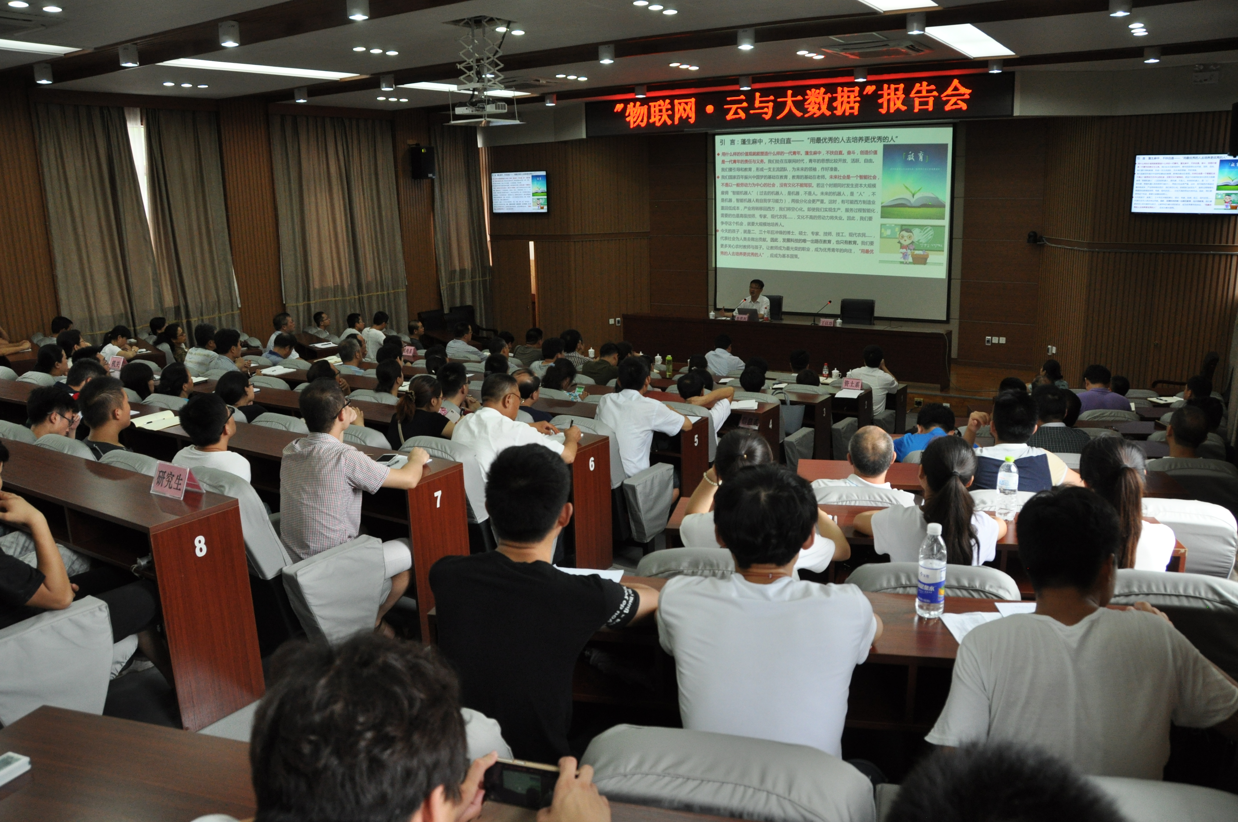 报告会上,崔洪利结合中国电信的技术发展,详细介绍了物联网的演化进程,与互联网的区别,云服务与大数据的概念、特点及发展优势,大数据的前沿现状,尤其介绍了大数据的开发应用和安全技术为泰安市做出的贡献等,为师生们描绘了一幅美不胜收的网络科技画卷。