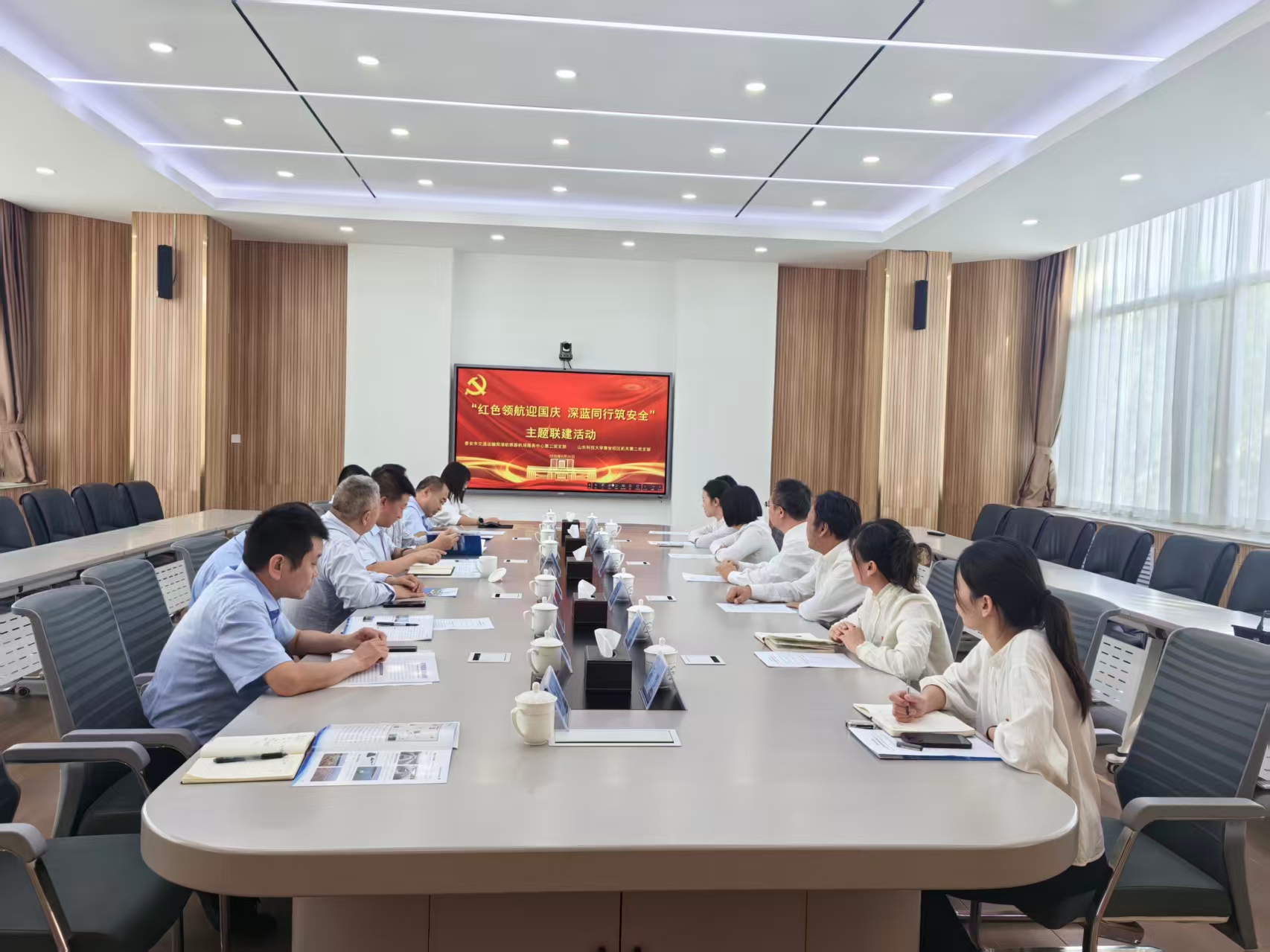 为迎接新中国成立76周年,深化党建引领,筑牢安全防线,9月25日,泰安市交通运输局港航铁路机场服务中心党委副书记董辰宏一行到泰安校区,与机关第二党支部开展“红色领航迎国庆 深蓝同行筑安全”主题联建活动并座谈交流。教务处副处长、校区机关第二党支部书记田建国接待了来访客人。