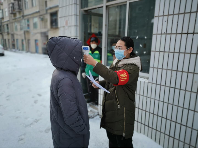 3044永利集团官网行政管理19-1刘奕男雪天为进出社区人员测体温