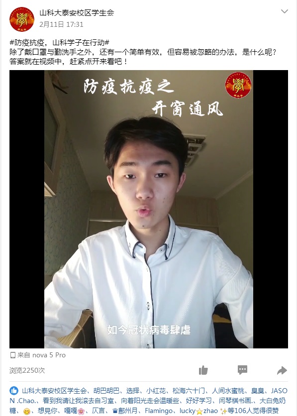 此外,还利用团委、学生会微信公众号、微博、QQ空间及时开辟“信息发布”“疫情通报”“防疫抗疫,山科学子在行动”“战疫情,一心移疫”等专栏,每天发布疫情状态及国务院相关疫情信息,普及防控知识等。仅校区学生会推送各类信息近百条,每条信息浏览次数均在1500次以上。