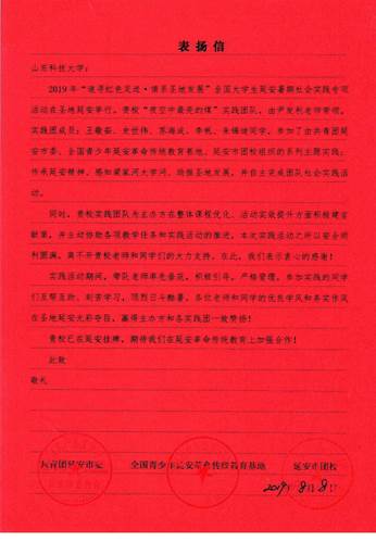 近日,共青团延安市委、全国青少年延安革命传统教育基地、延安市团校给我校发来表扬信,对我校暑假期间赴延安参加追寻革命圣地情系圣地发展活动的优异表现提出表扬。